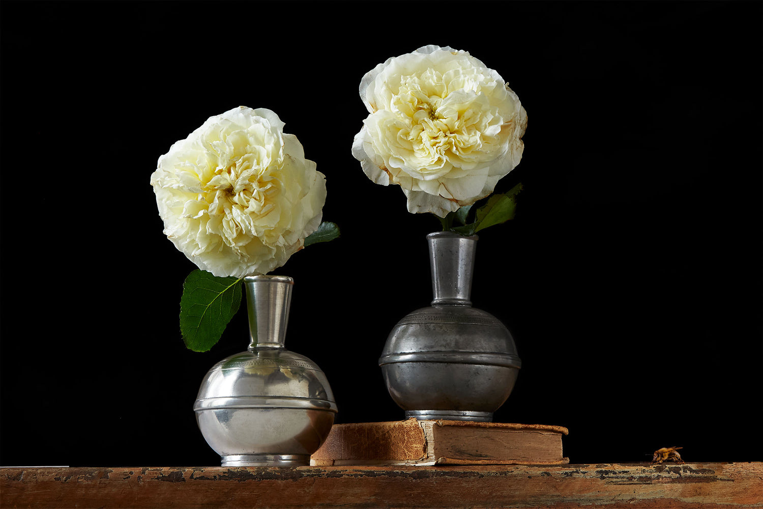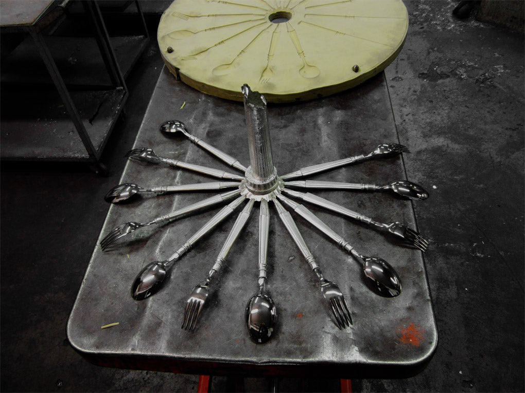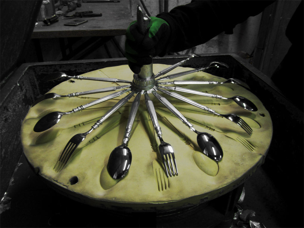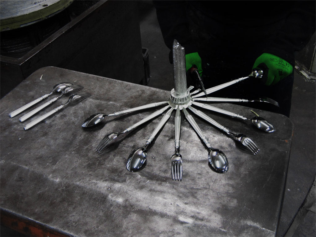 The machine is closed, and the mold spins at very high speed. Molten pewter poured into the center of the spinning mold is drawn by centrifugal force into the open spaces of the mold. This forms the handles and surrounds the thin shafts of the steel forks and spoons creating a single, unified piece of flatware.