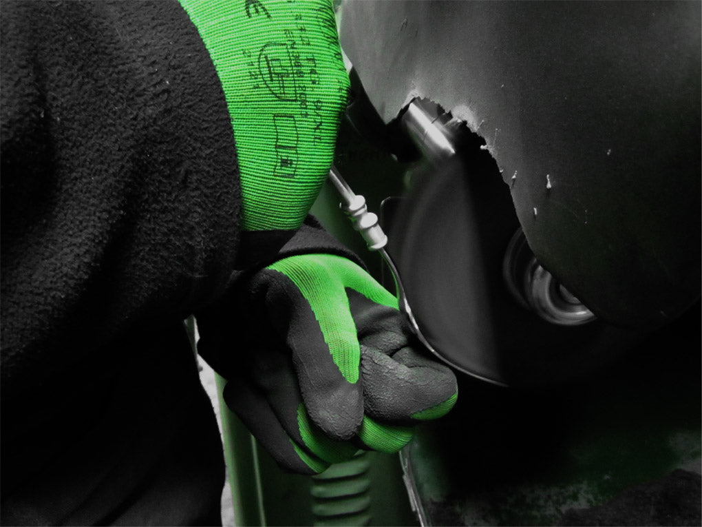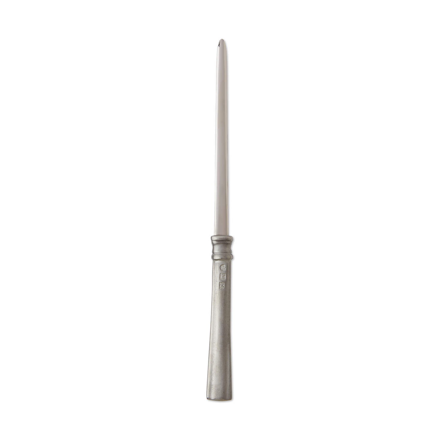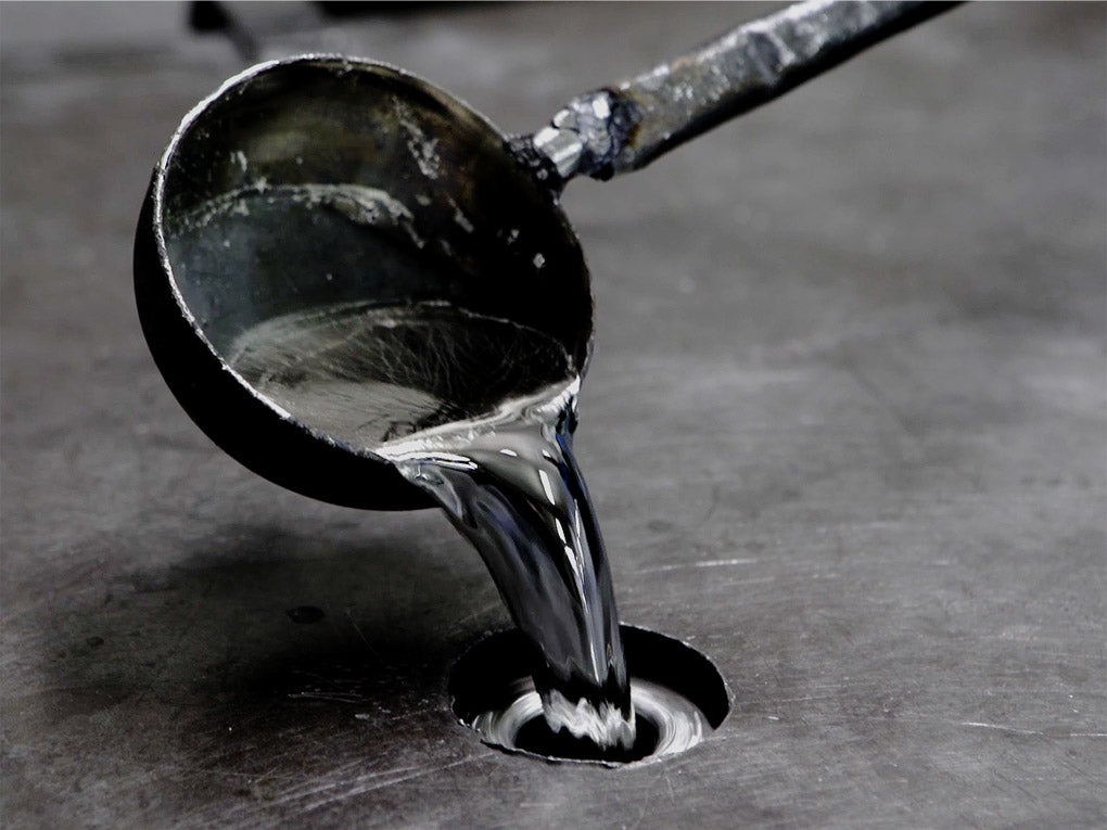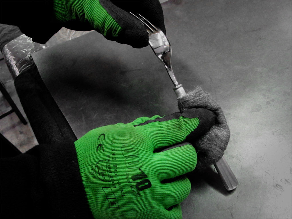 Filing is done by hand to remove any traces of excess pewter and sharpen thedetails of the pewter handle.