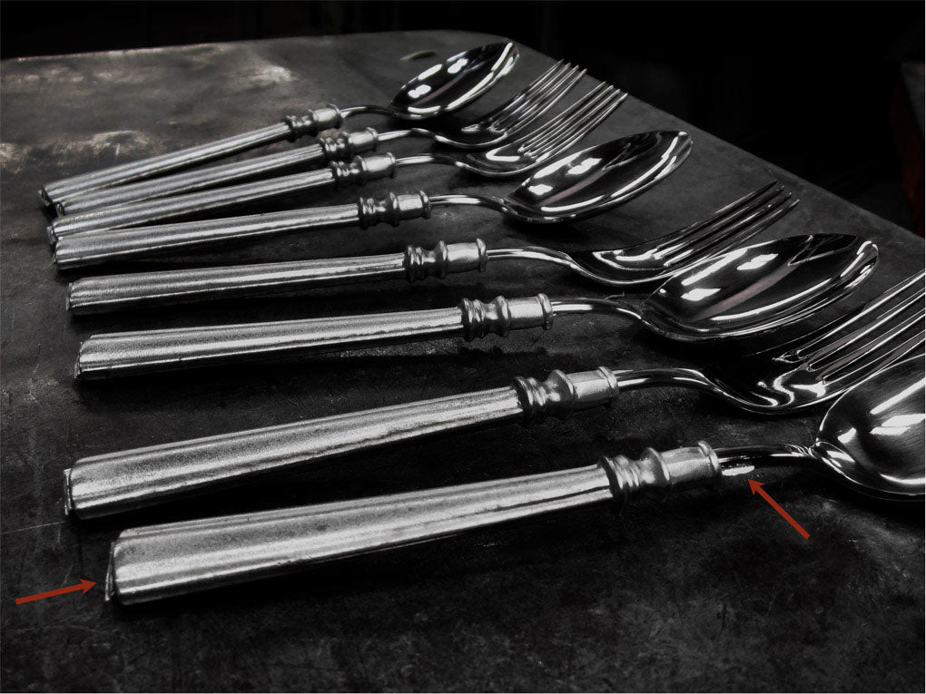 Newly 'freed' forks and spoons. Note the sharp ends of the handles and evidence of excess pewter around the stainless steel closest to the handles.