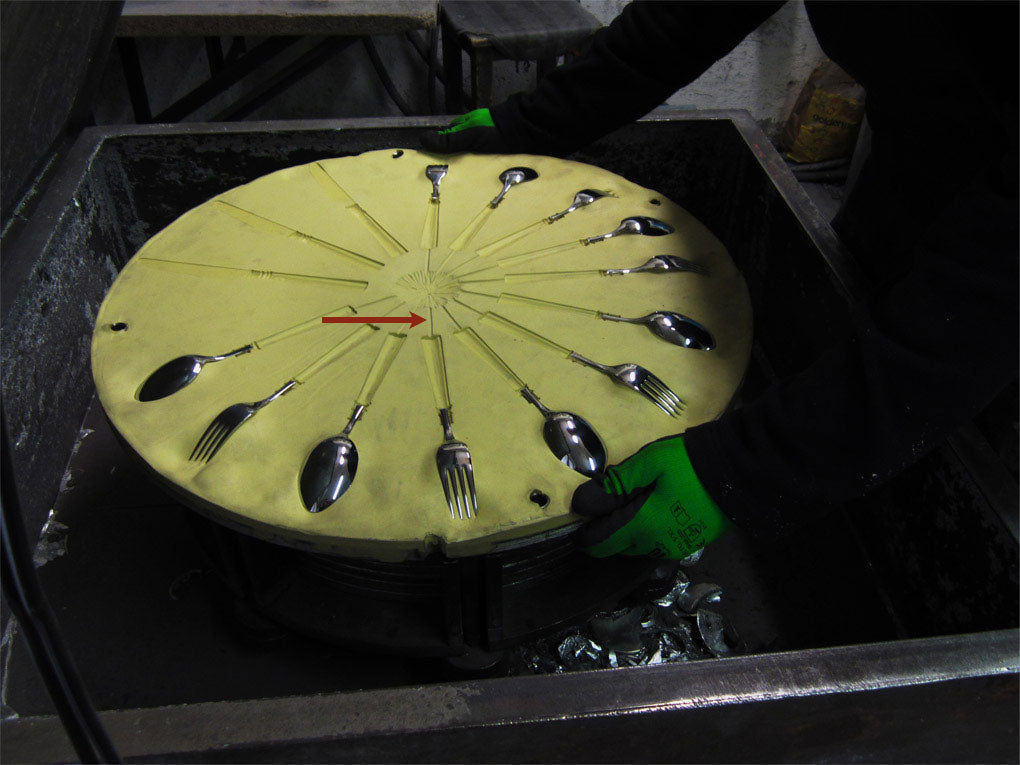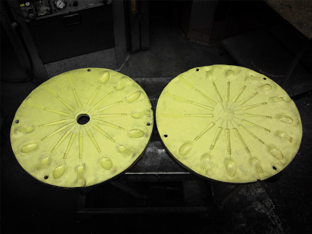 Both parts of the mold are placed in the casting machine, and the mold is clamped together before closing the machine. Note the thin channels leading from the central depression of the mold to the ends of the of the spaces that will become handles of the forks and spoons.