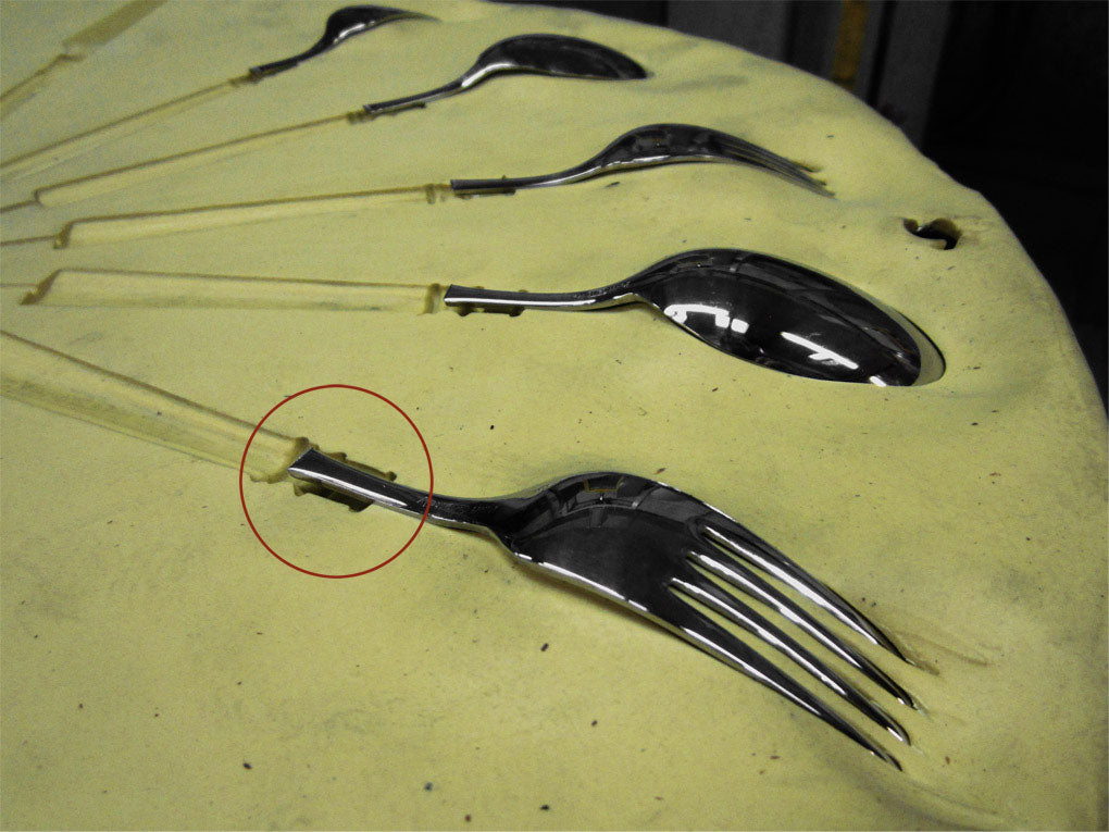 The mold for Lucia dinner forks and spoons. All MATCH flatware is made by casting pewter around stainless steel working ends. No adhesive is used.