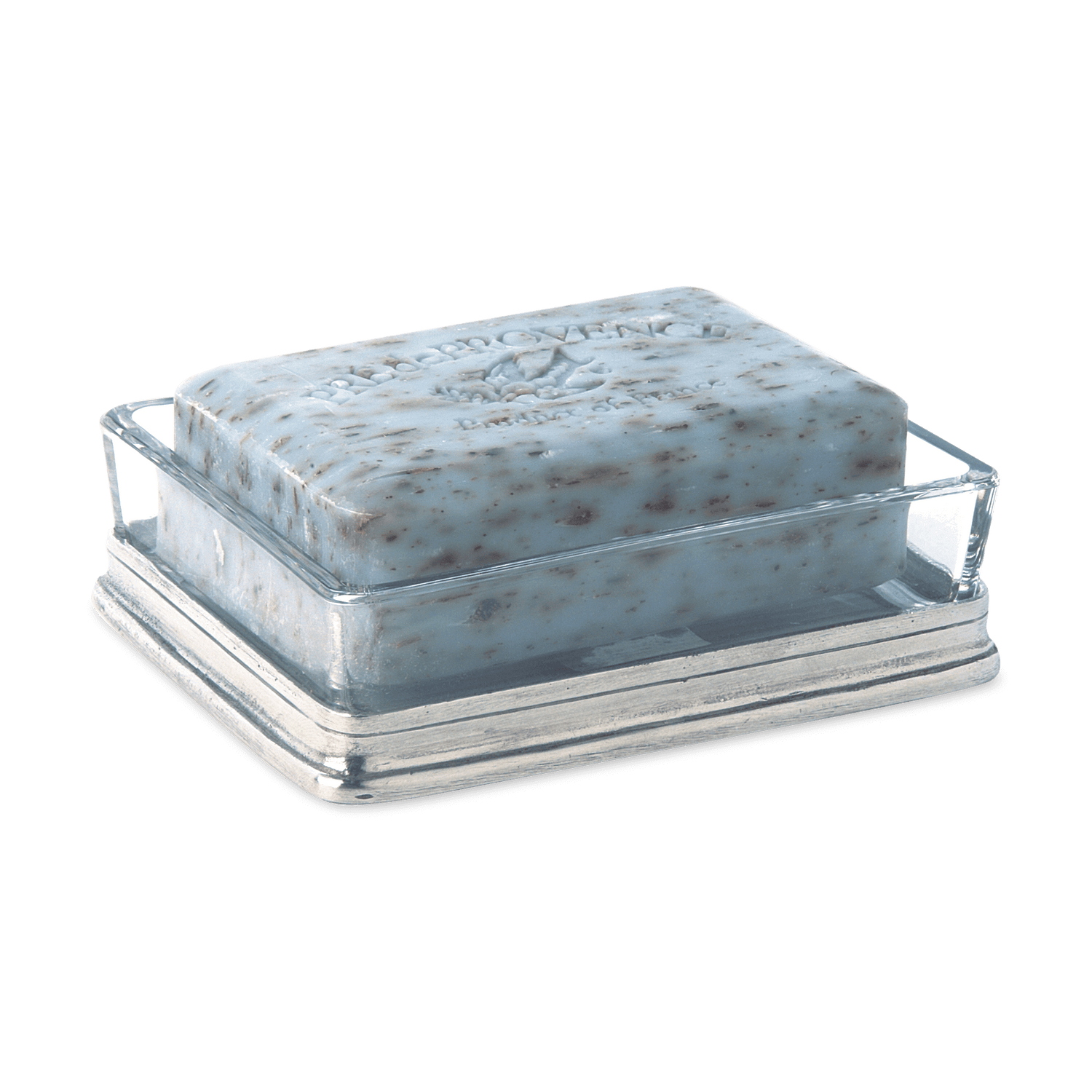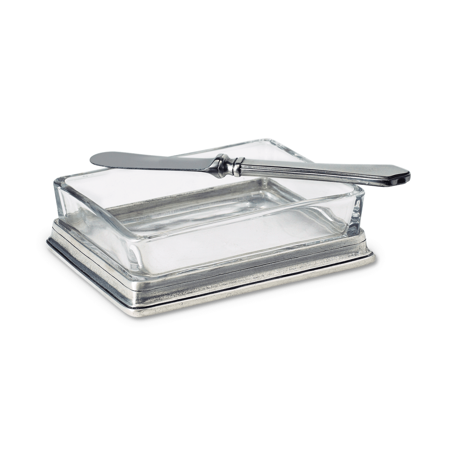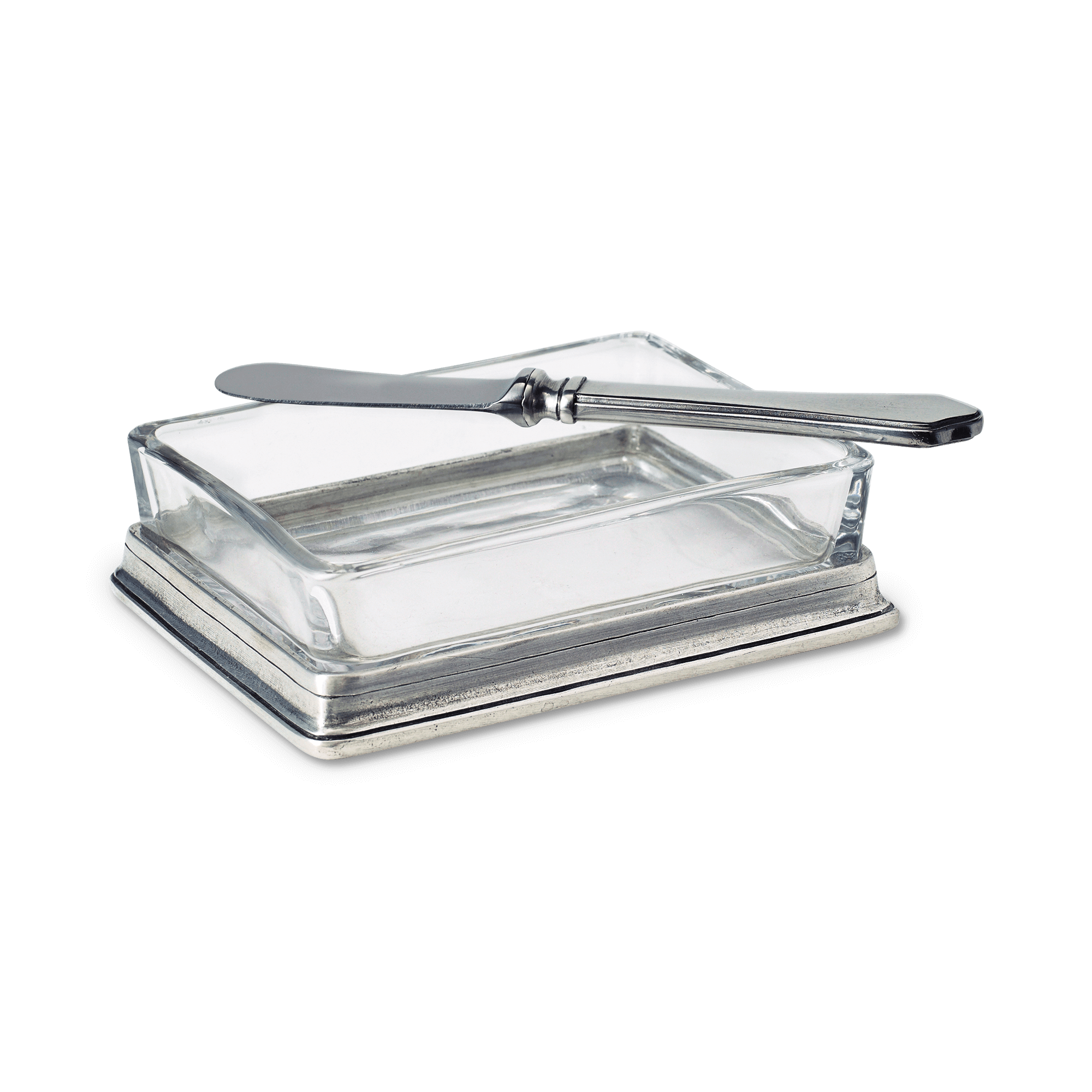A versatile design, this elegant glass and pewter dish makes a refined receptacle for butter or spreads at the dining table, or a graceful home for your favorite bar soap in the bath.