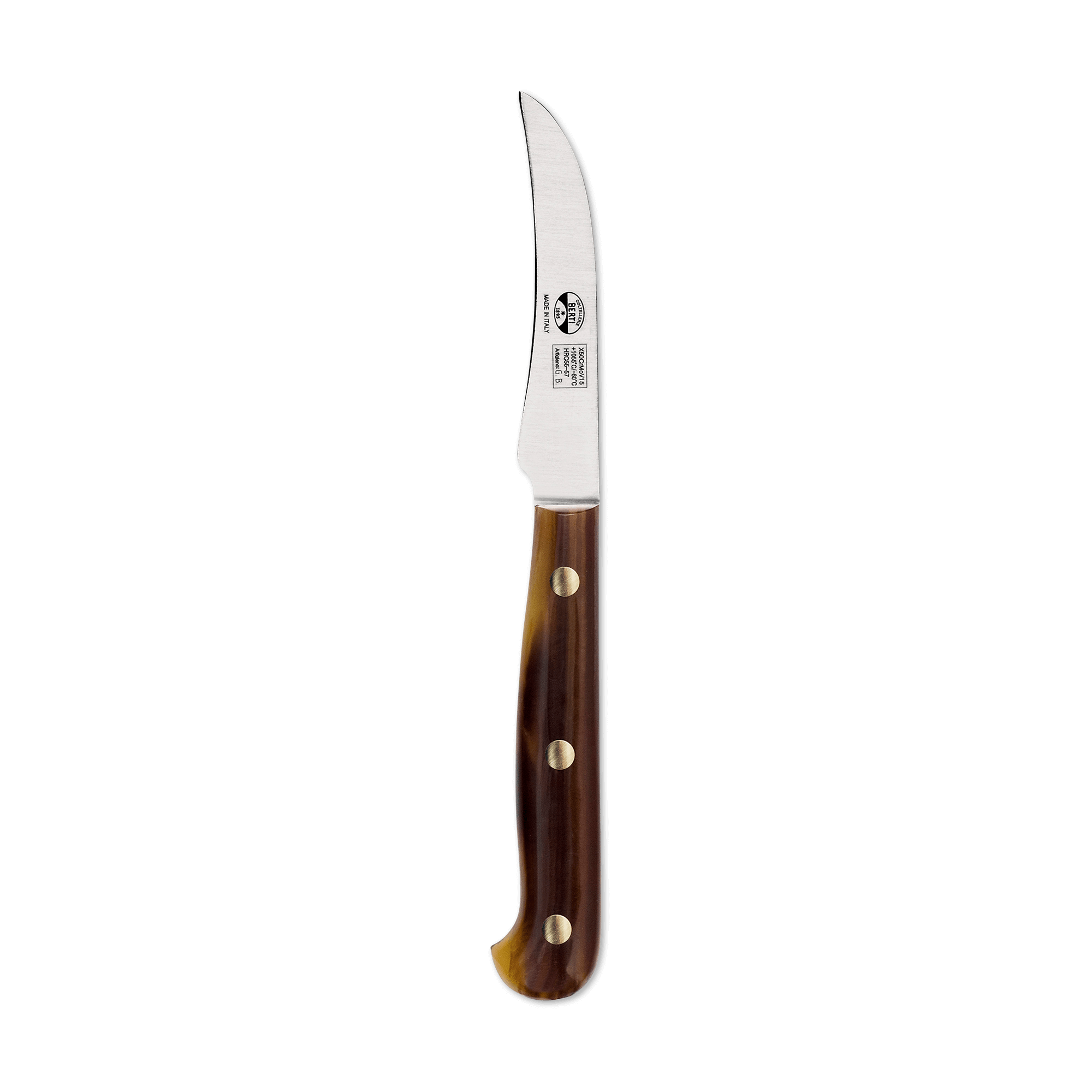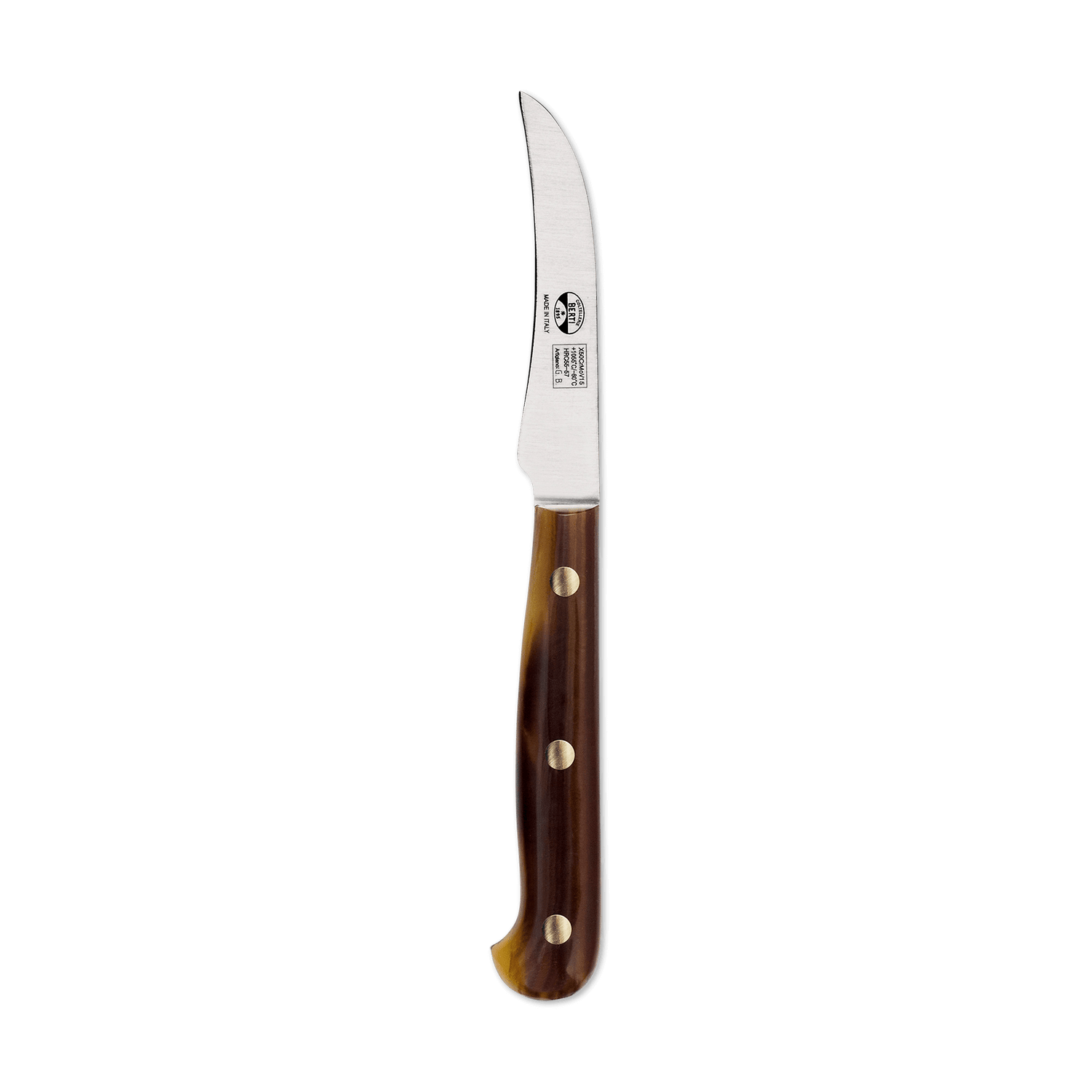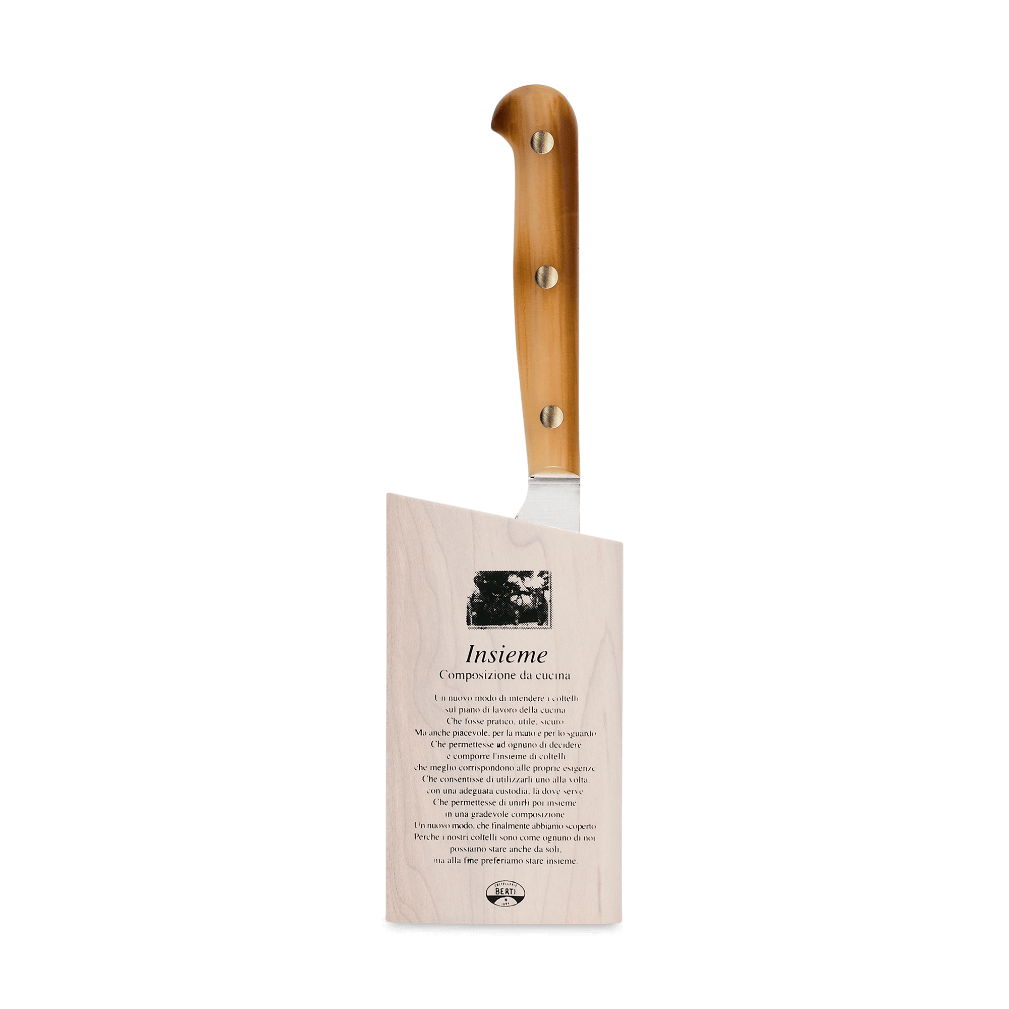 A distinctive and beautiful paring knife from Berti featuring a full tang steel blade curved for added leverage, and a Cornotech handle which has the look of classic Ox horn but with added durability. Available with or without block. Part of the "Insieme" system, it comes secured in a magnetized wood block that interlocks with the rest of the collection for your own customizable storage system.