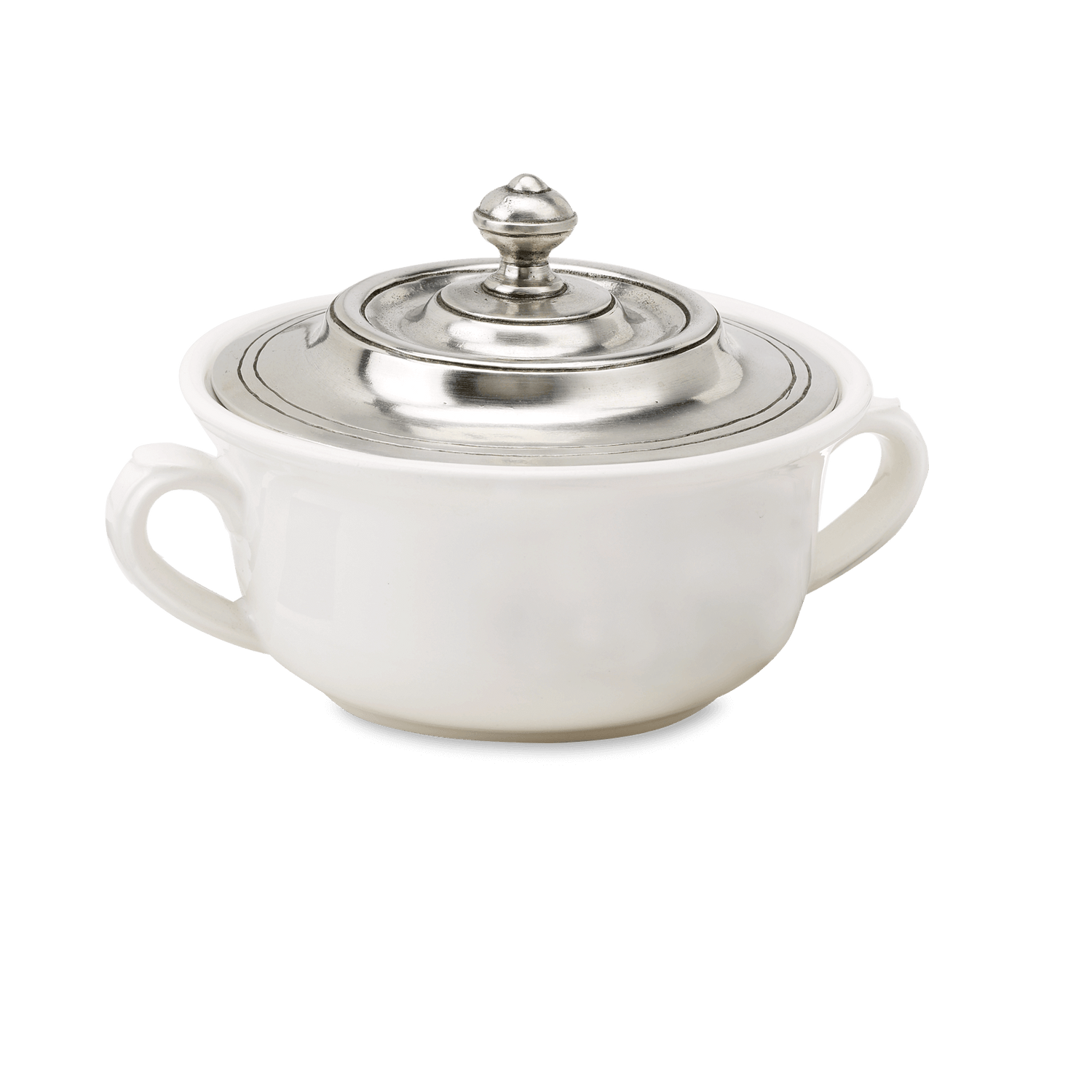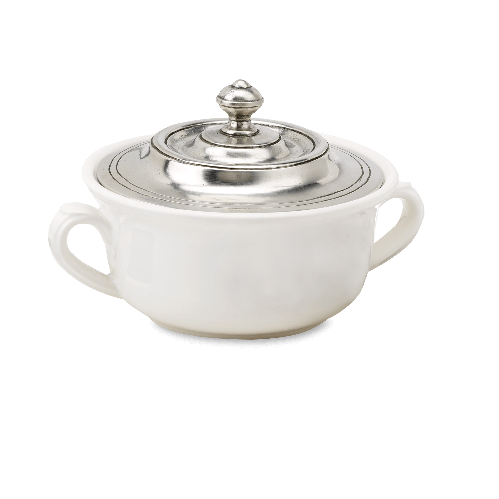 Not only does this elegant covered soup bowl keep its contents piping hot from kitchen to table, it makes for an inspired presentation that's sure to make your guests smile. Made by hand from ceramic and Italian pewter.