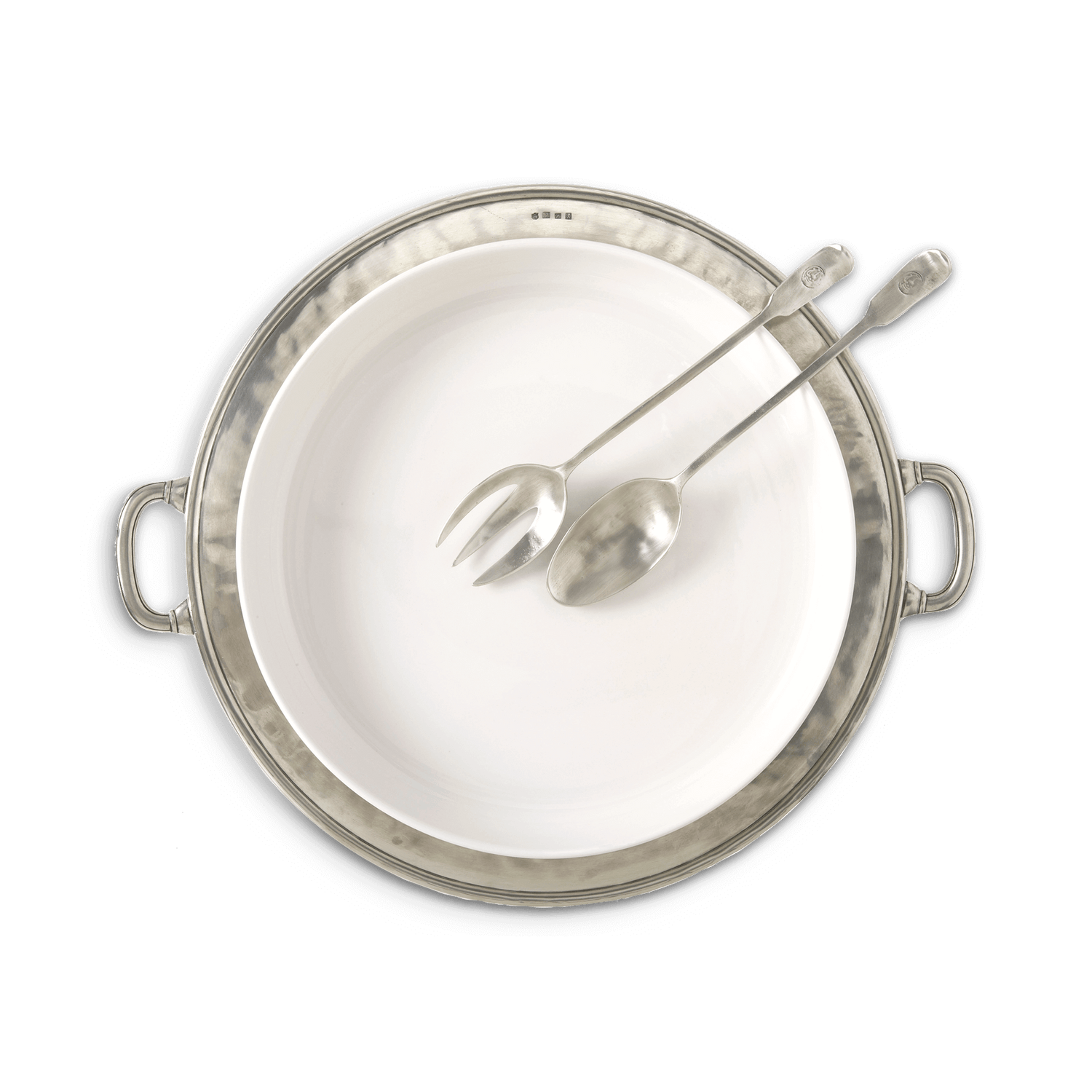 A generously proportioned, two-part serving platter featuring a round all-pewter tray with handles and a removable oven and dishwasher-safe ceramic insert. It will comfortably hold a pasta dinner for eight, or large salad. This tray can also accommodate the ceramic pieces of our sectional platter (item 1527), and all can be purchased separately.