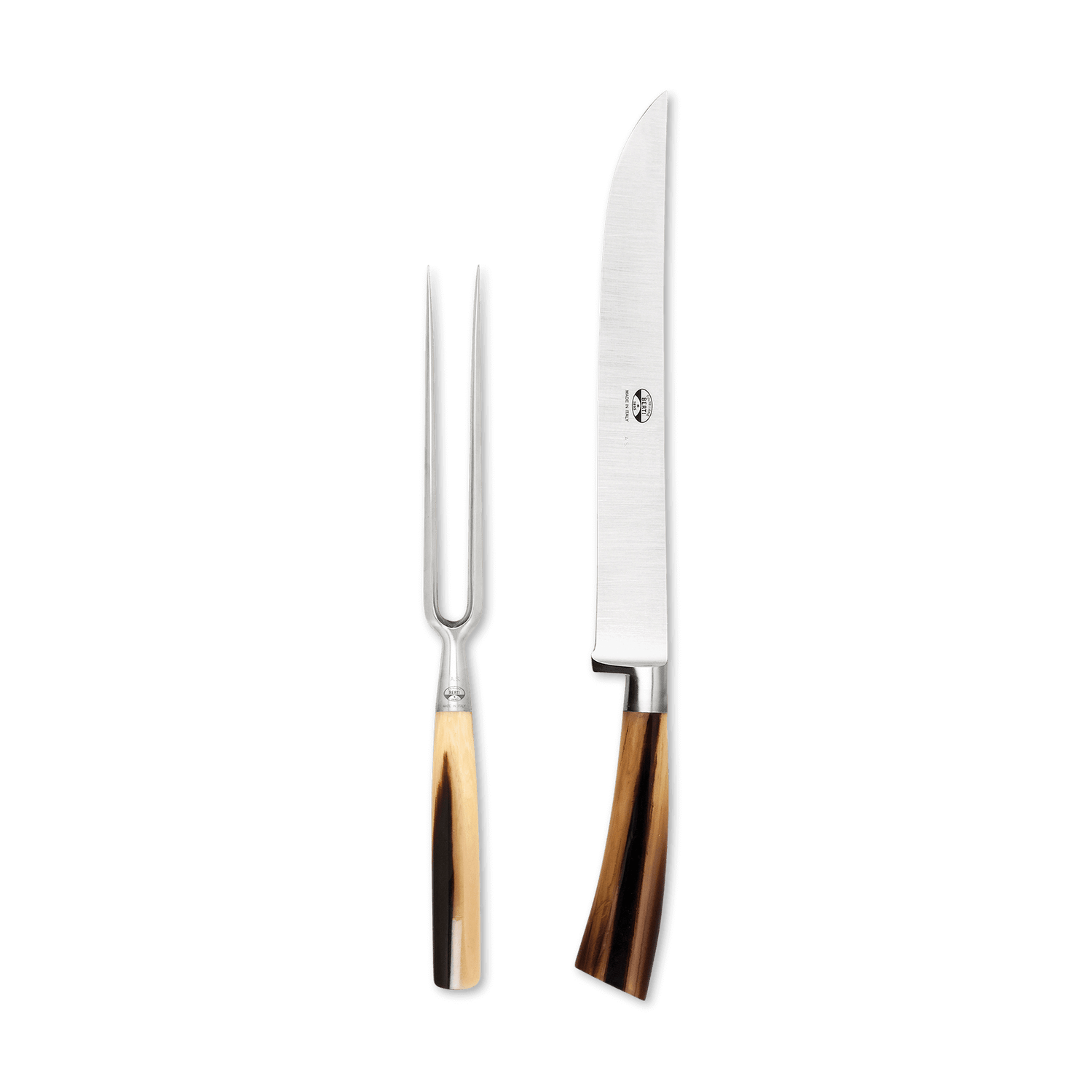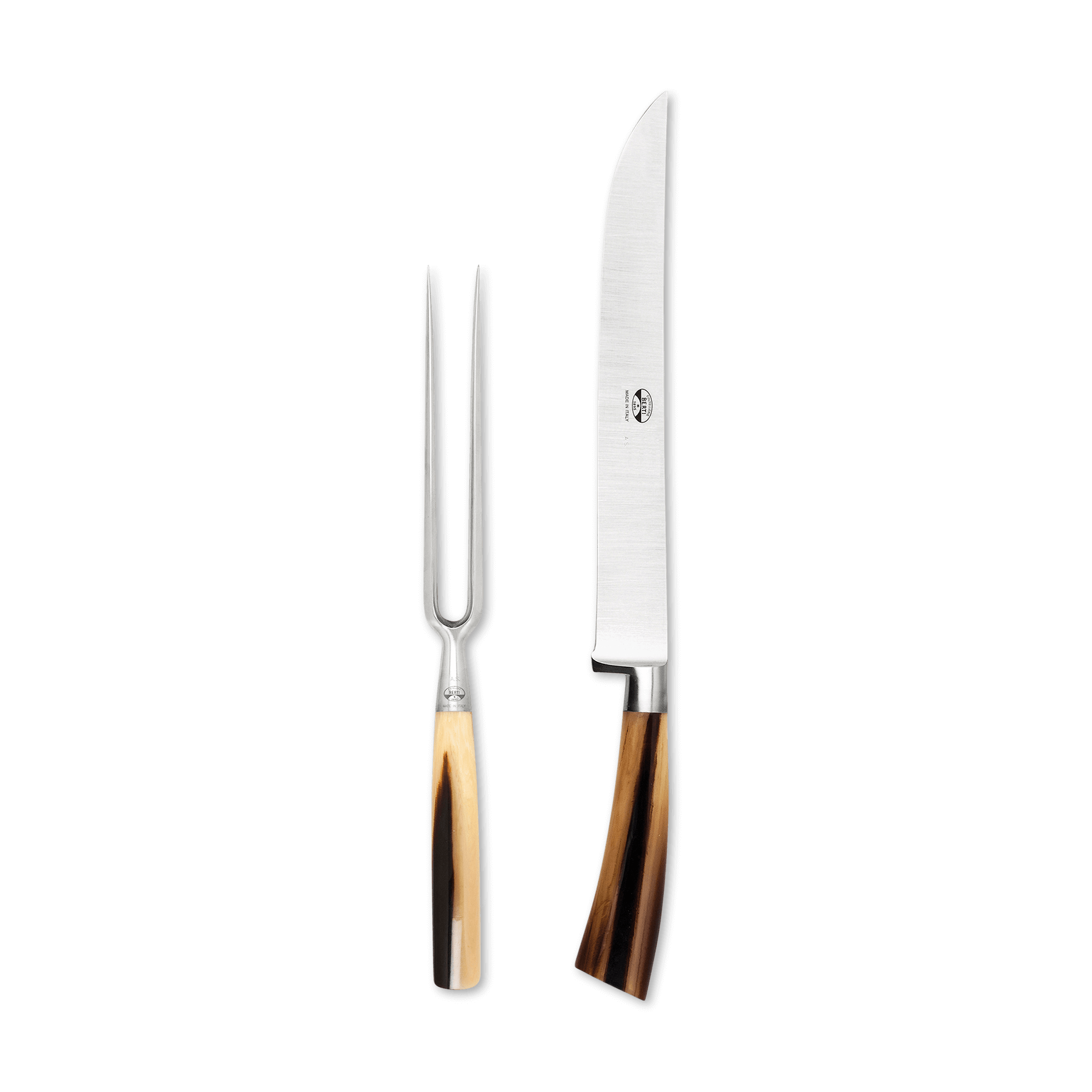 This Berti carving set is exquisitely crafted from hand-forged steel blades and polished Lucite handles. Well proportioned to handle even the largest of roasts, there's no better way to show off your carving mastery.