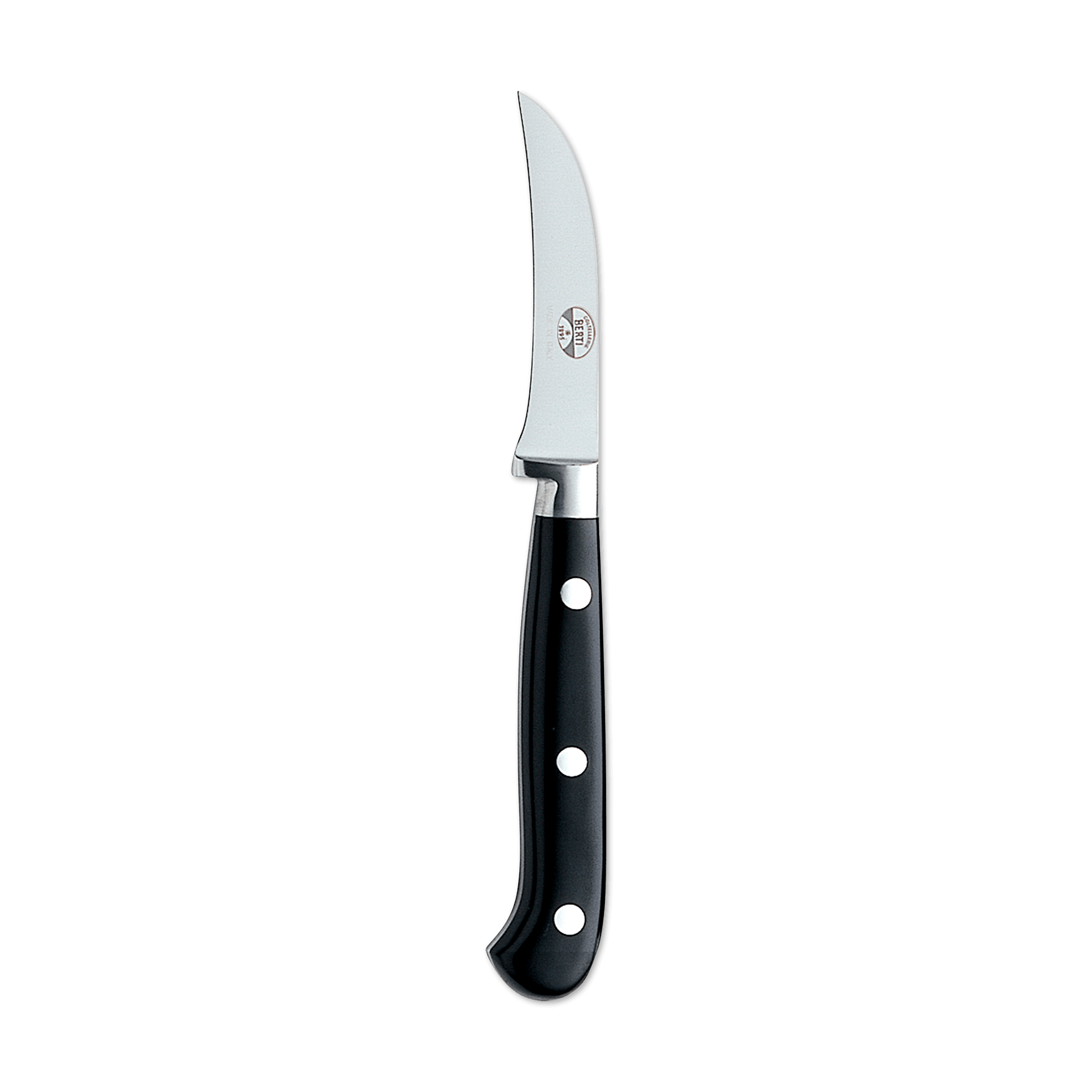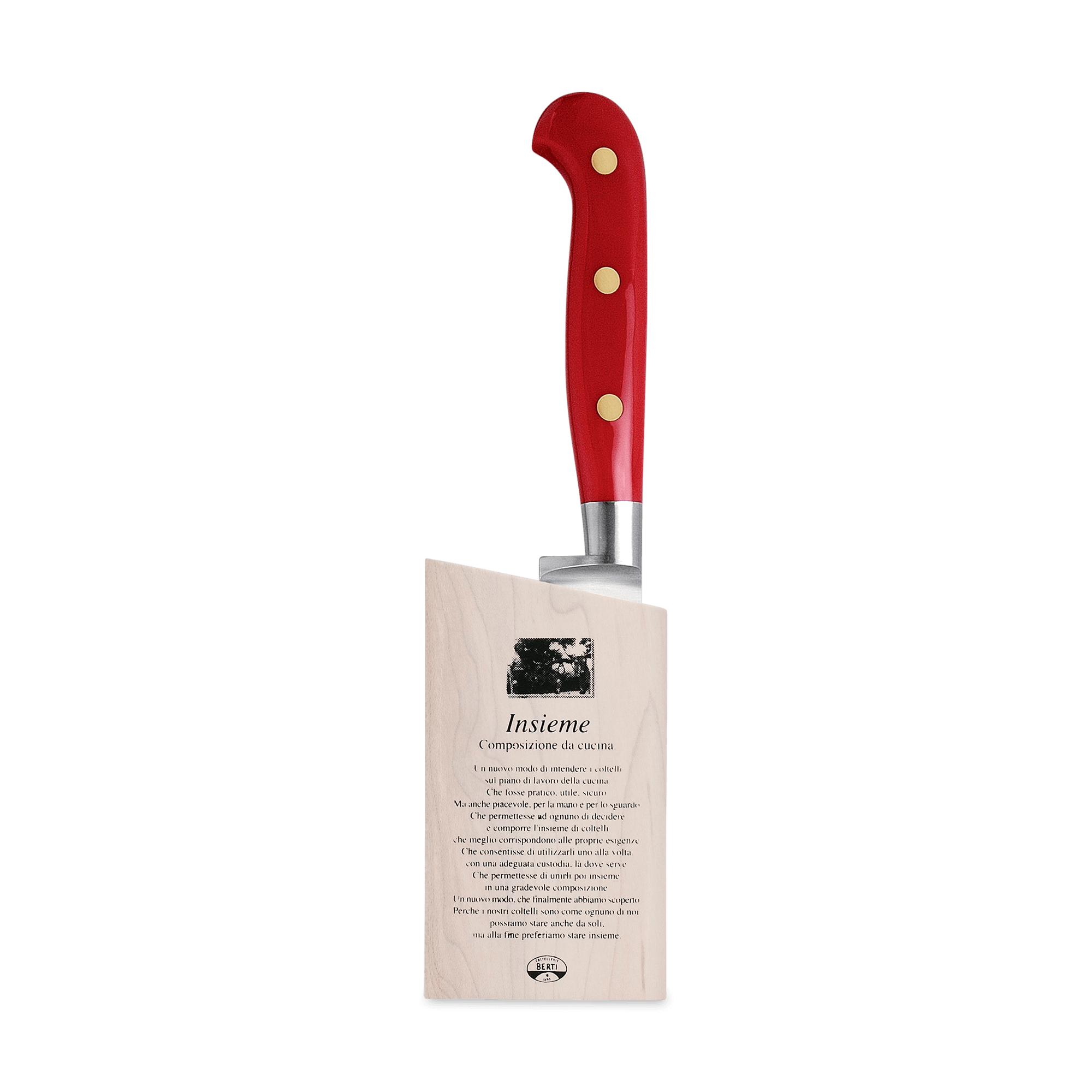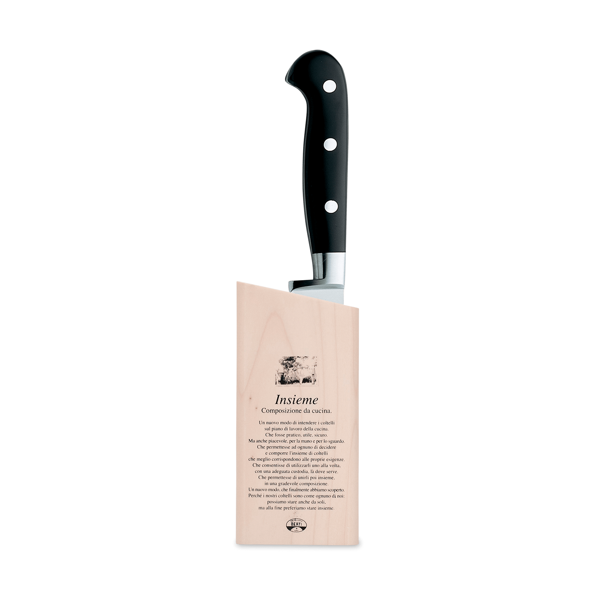A beautiful marriage of form and function, the Berti curved paring knife features a forged, full tang steel blade and a Lucite handle. Available with or without block. Part of the "Insieme" system, it comes secured in a magnetized wood block that interlocks with the rest of the collection for your own customizable storage system.