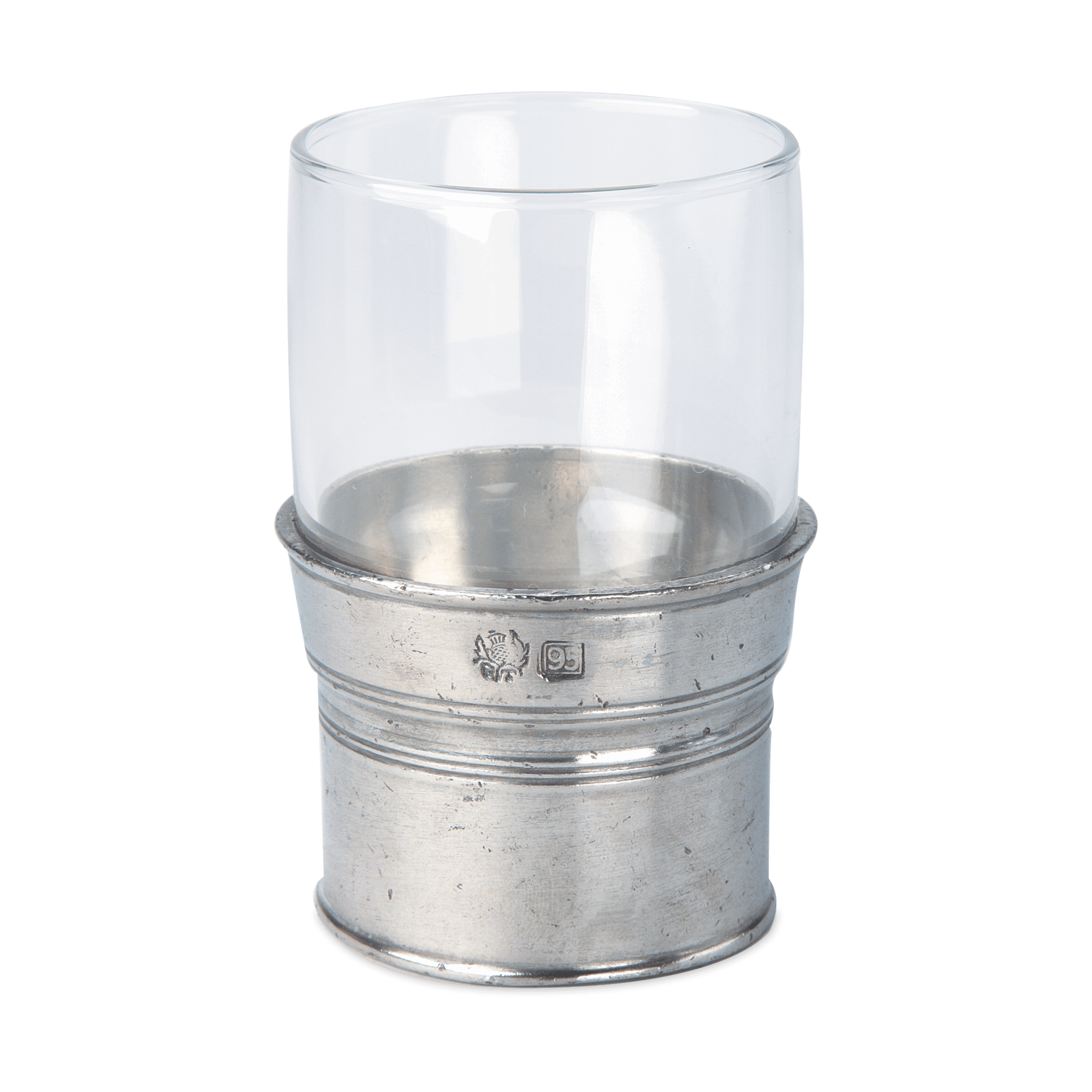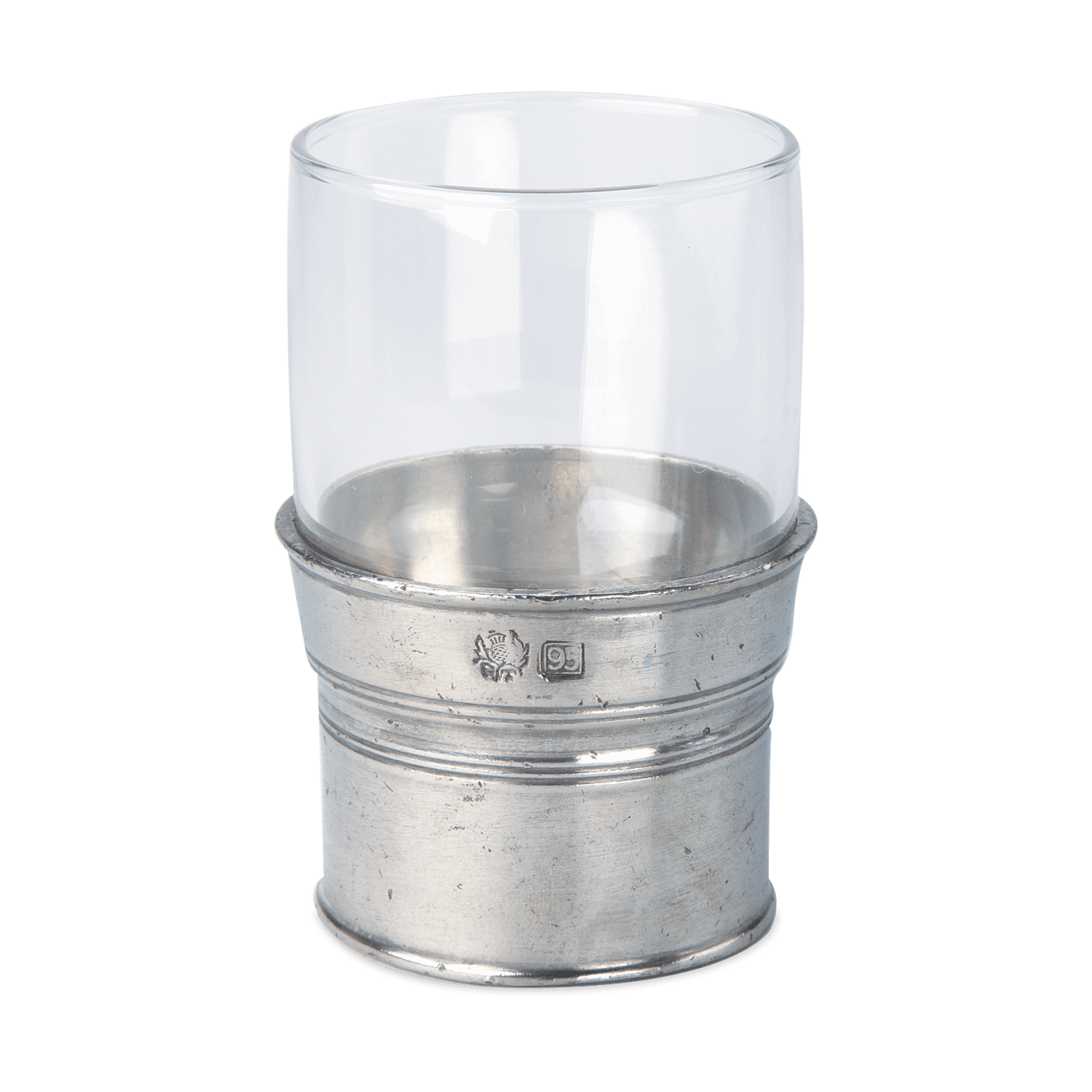 An elegant start to your morning routine. Our glass and pewter drinking cup features a removable, dishwasher safe glass insert. Perfect for the bath or bedside.