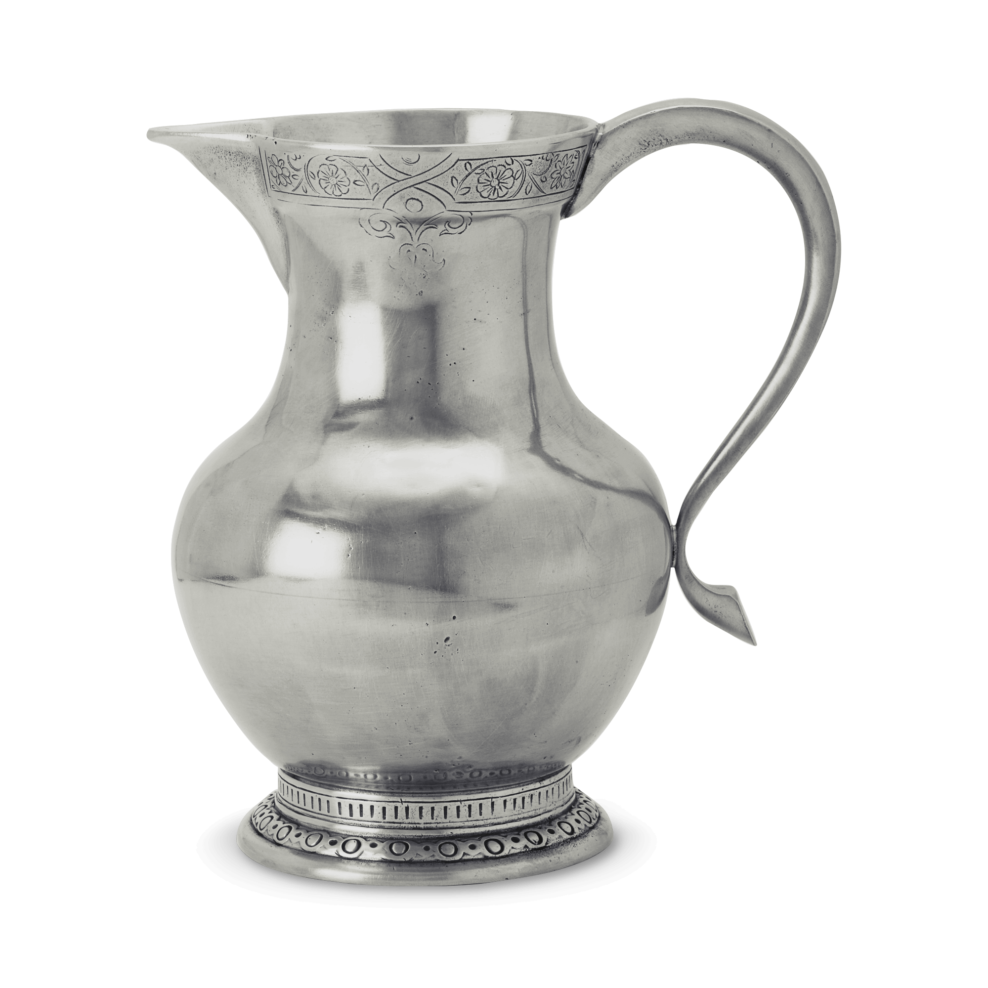 A classic water pitcher or a stylish vessel for floral bouquets. With its floral motifs and Renaissance silhouette, this versatile, all-pewter pitcher brings a timeless beauty to any table top.