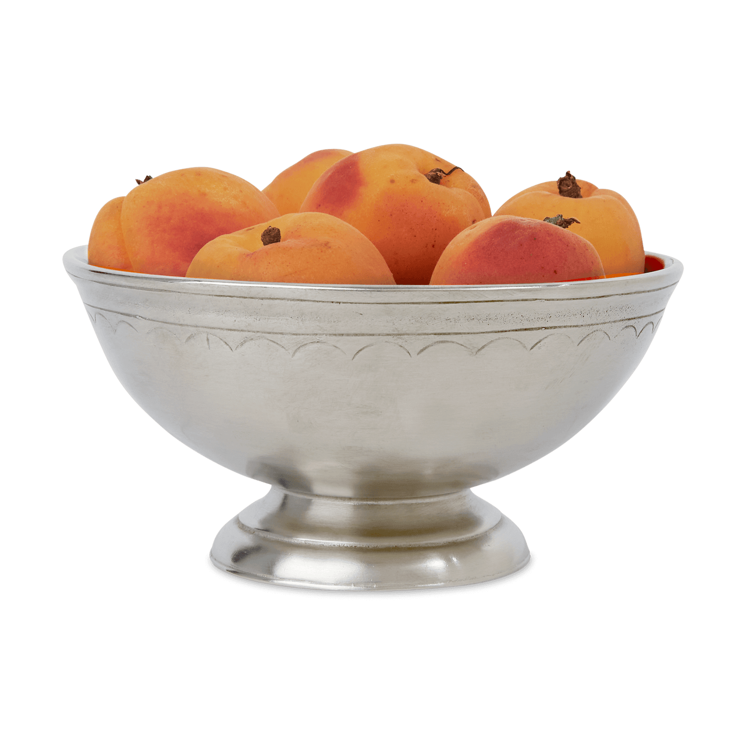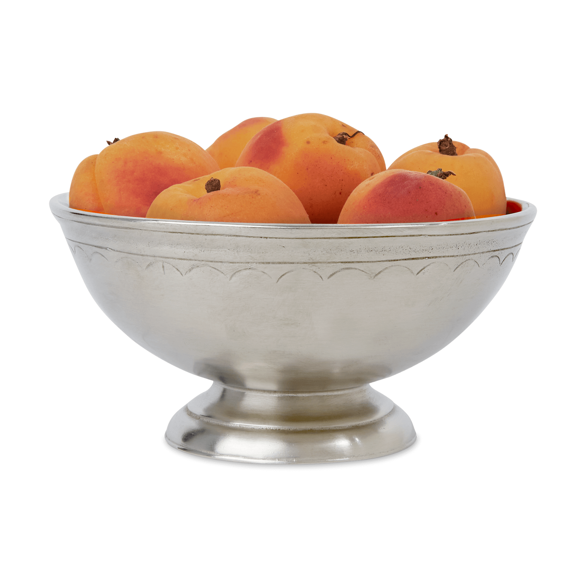 A charming, modestly scaled footed bowl featuring a delicate scallop design along the rim. Versatile enough to feel at home on a bar or coffee table filled with snacks, as it is on a vanity displaying guest soaps or potpourri.