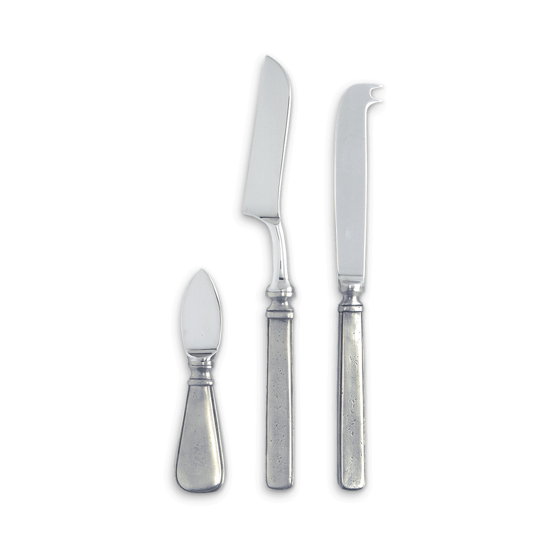 The Gabriella flatware pattern is a classic, simple design featuring subtle architectural details including a thumbnail edge and a banded collar. The simplicity allows this handsome 3-piece pewter & stainless steel cheese knife set to work with any table setting. The set includes a soft cheese knife, hard cheese knife with prong end, and a parmesan knife.