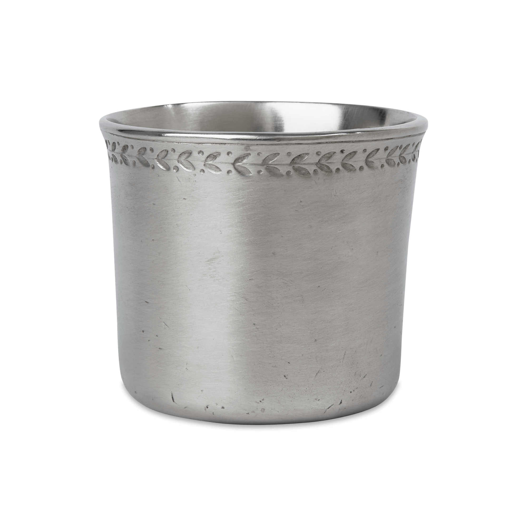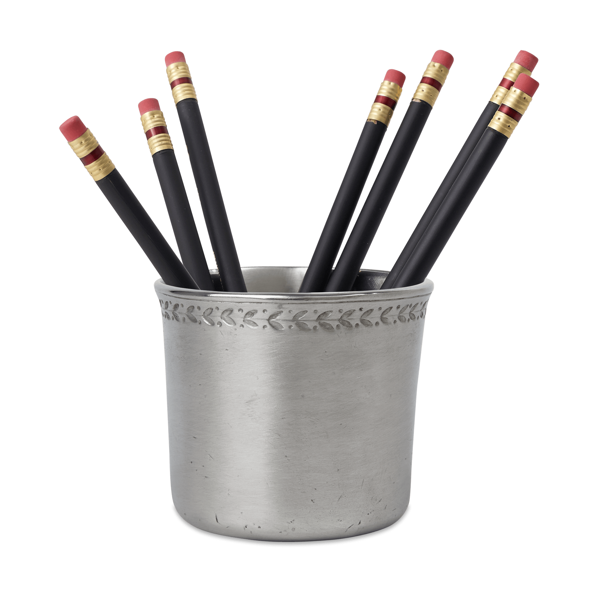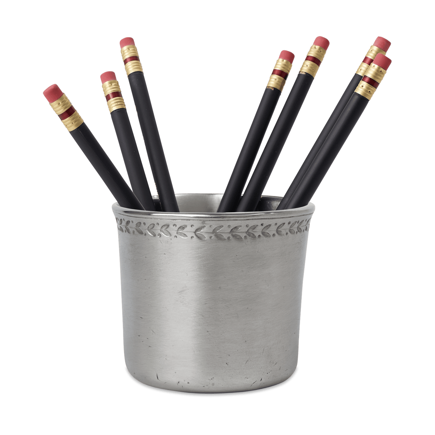 With its charming leaf motif, this pewter cup makes a graceful home for anything it holds. Whether it's pencils or even a petite bouquet for the bedside or desktop.