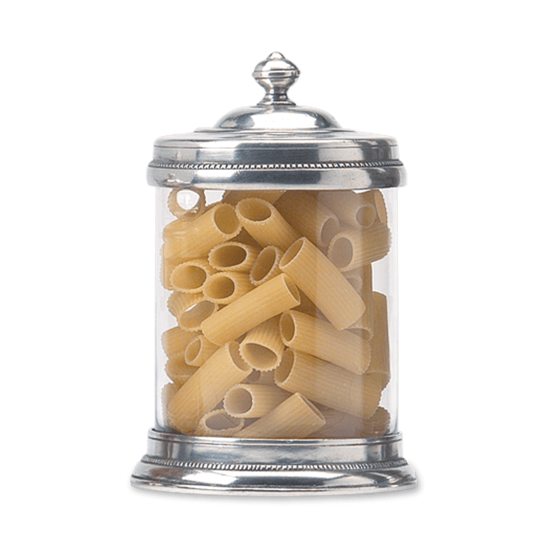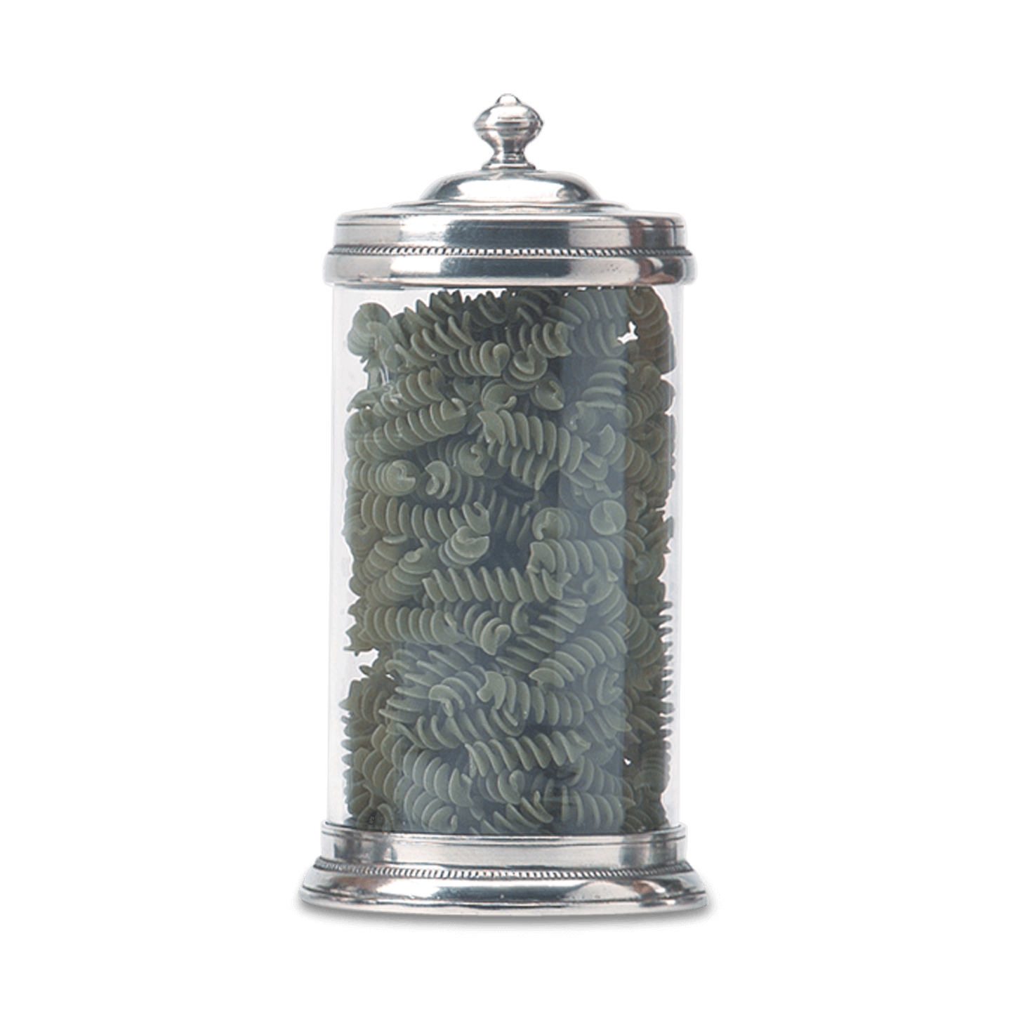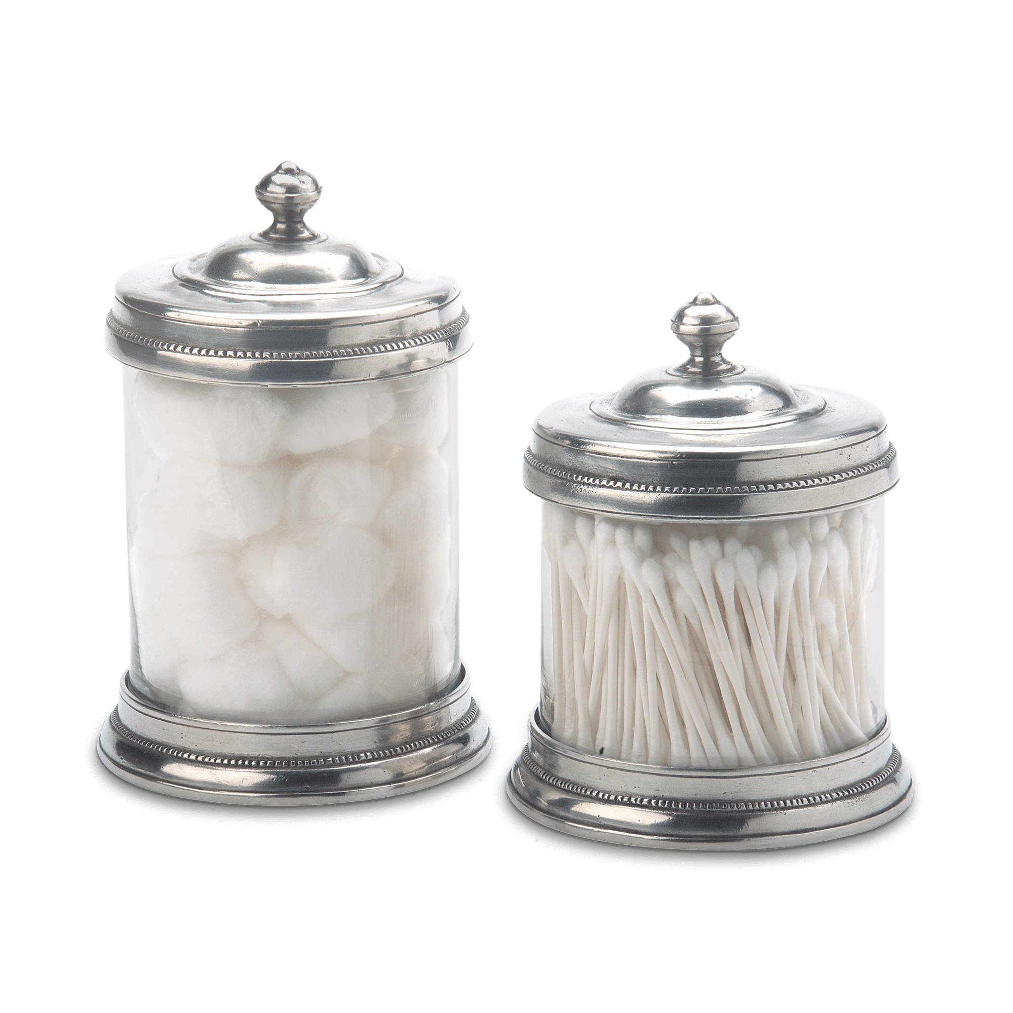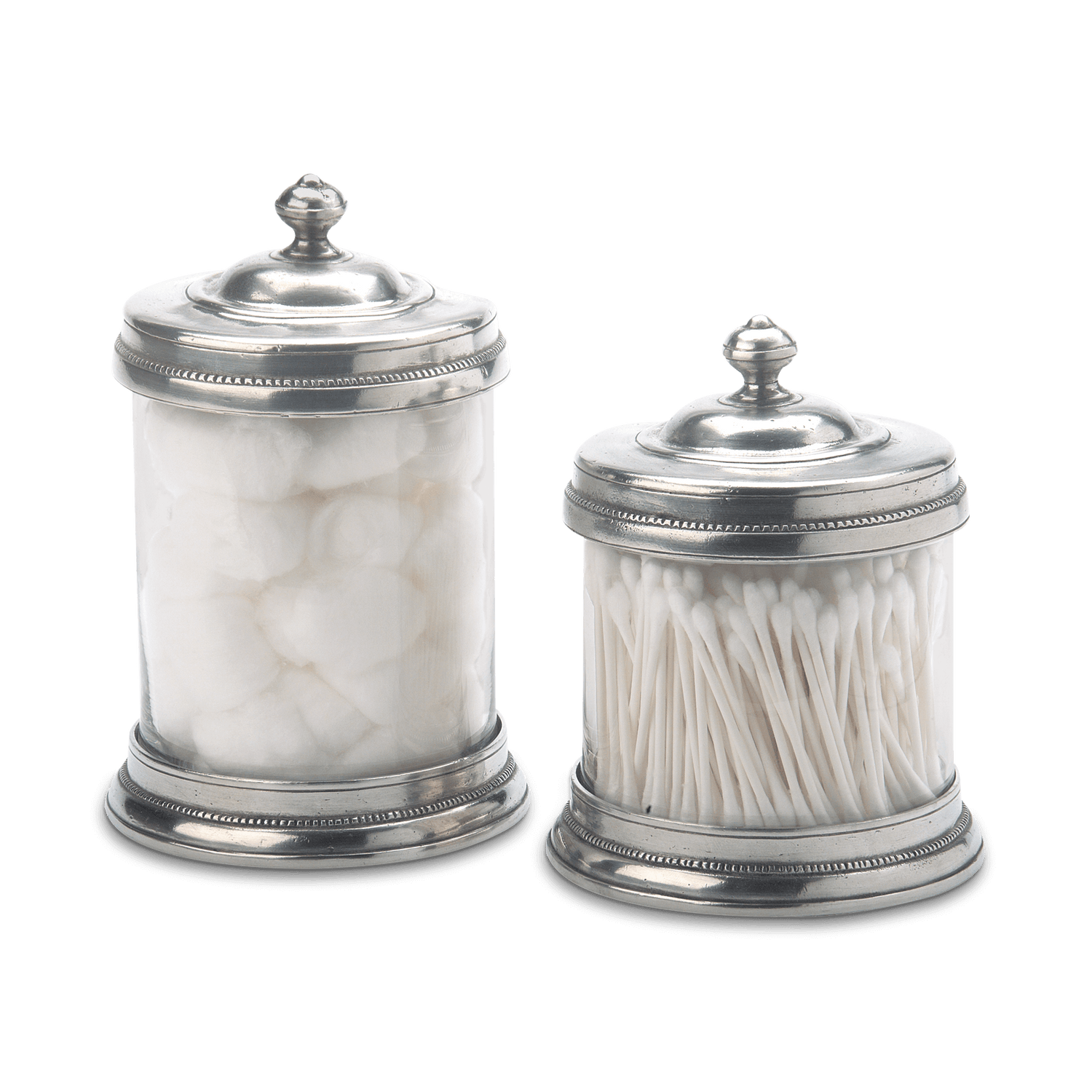 This elegant glass and pewter canister is a member of our versatile family of glass canisters, available in multiple sizes. Their functionality is only limited by your imagination; we’ve filled them with cotton balls and swabs in the bath, dry goods in the kitchen and even to display shells or other collectibles (design tip: group multiples to make a stylish statement).