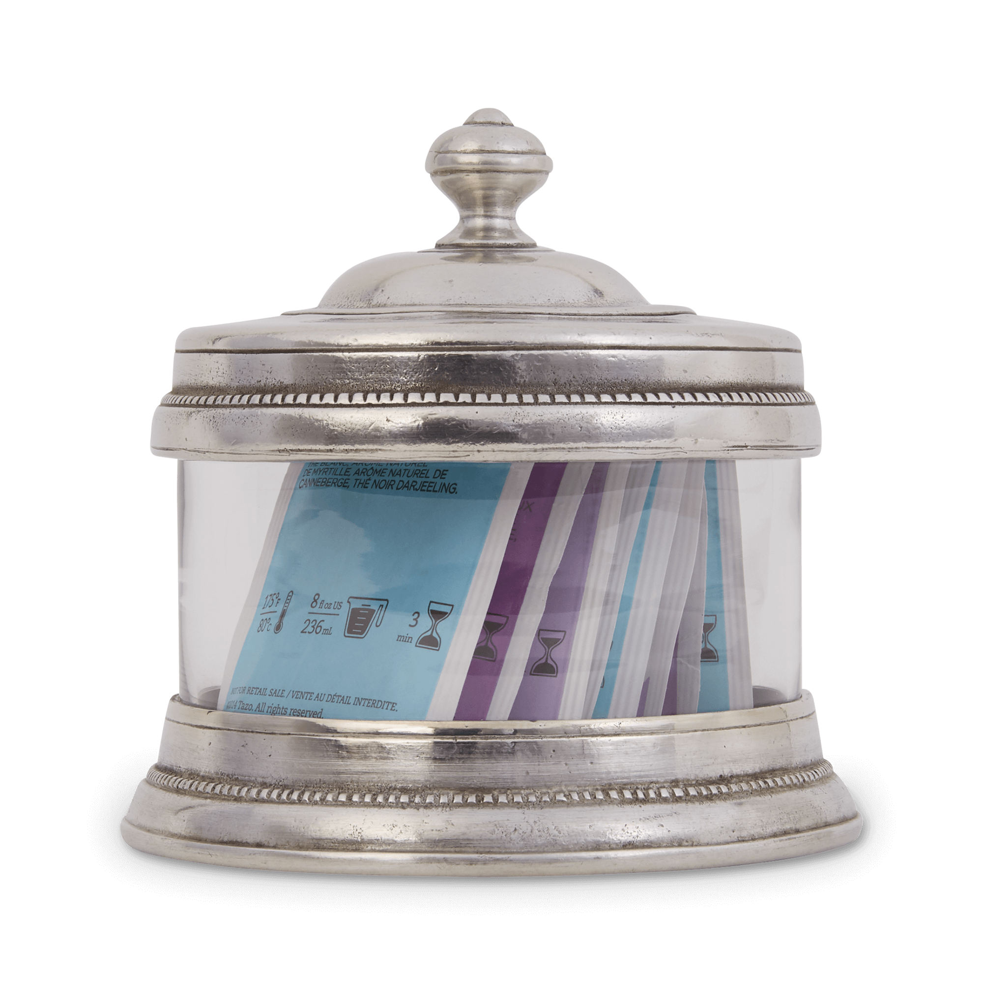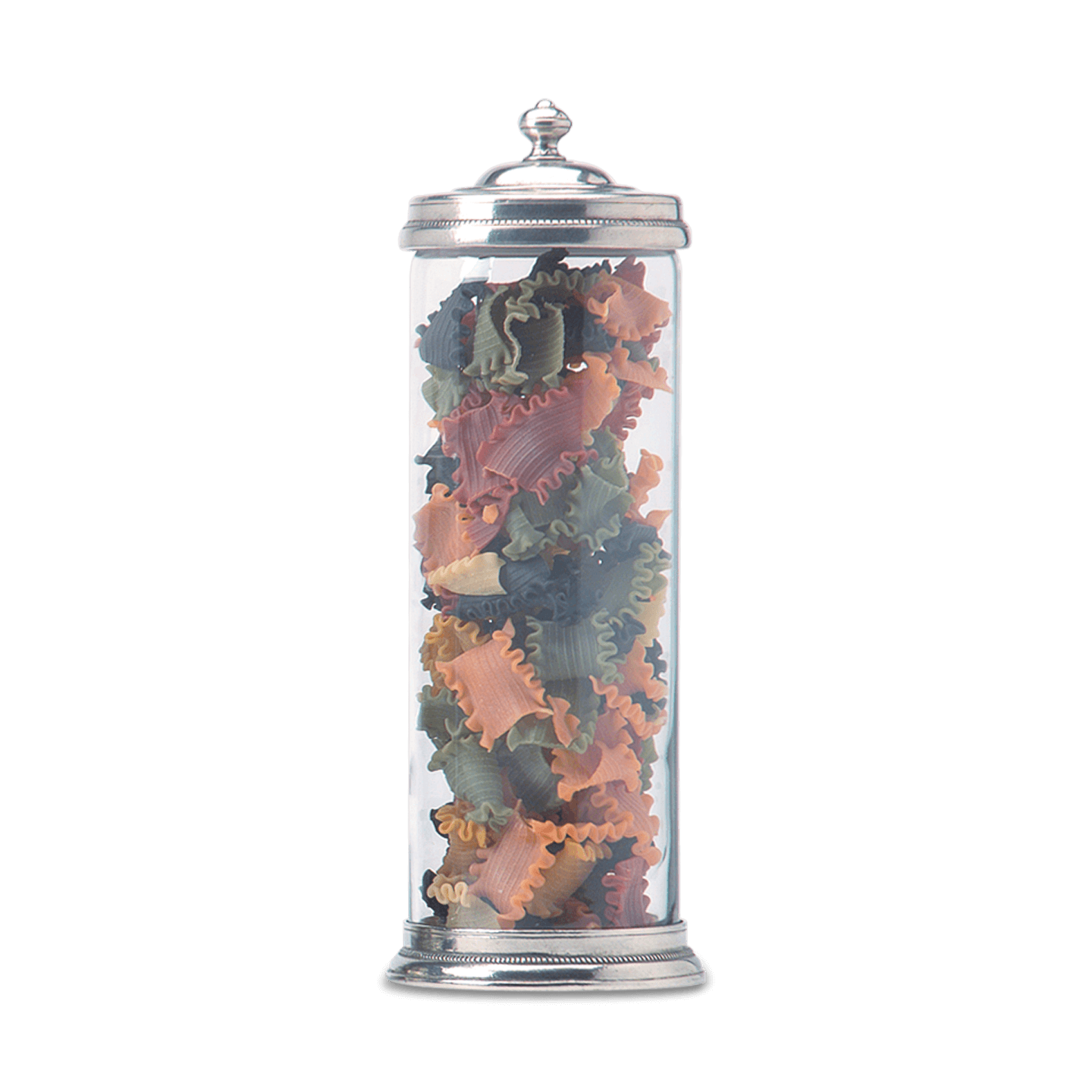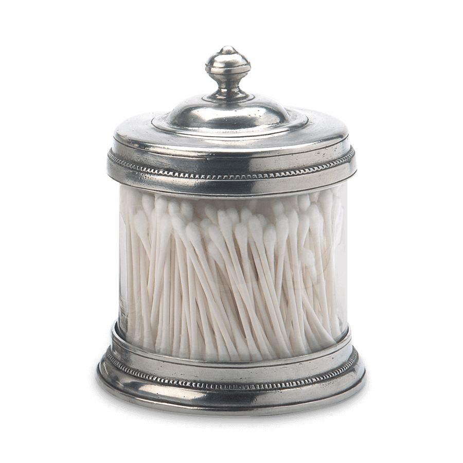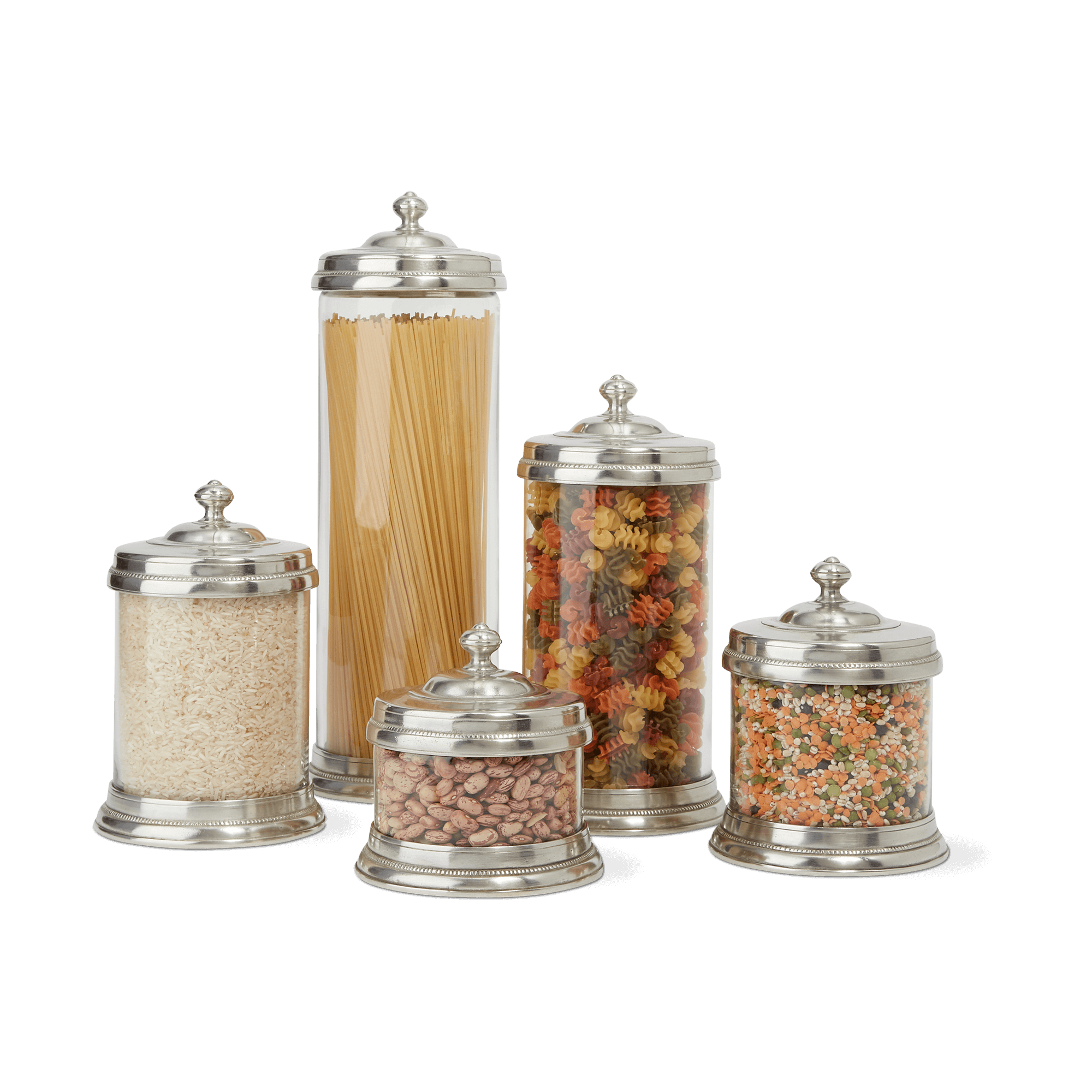 This elegant glass and pewter canister is a member of our versatile family of glass canisters, available in multiple sizes. Their functionality is only limited by your imagination; we’ve filled them with cotton balls and swabs in the bath, dry goods in the kitchen and even to display shells or other collectibles (design tip: group multiples to make a stylish statement).