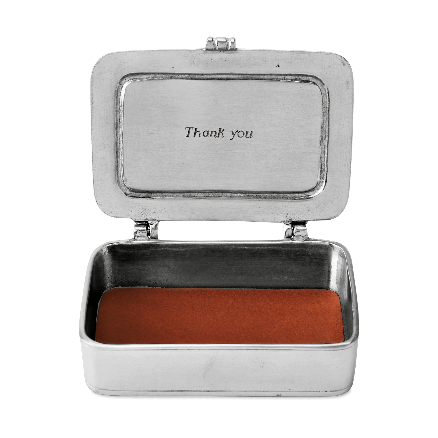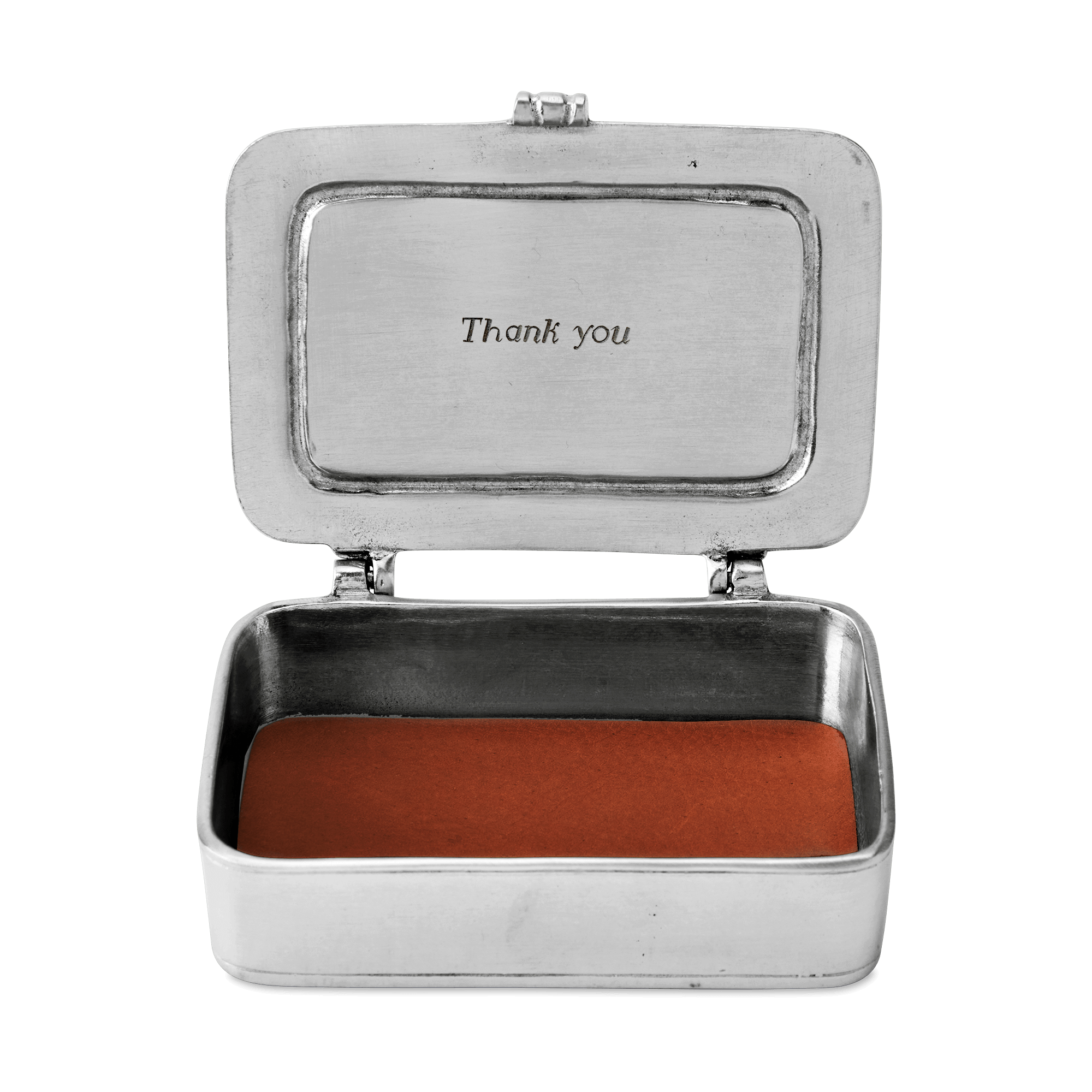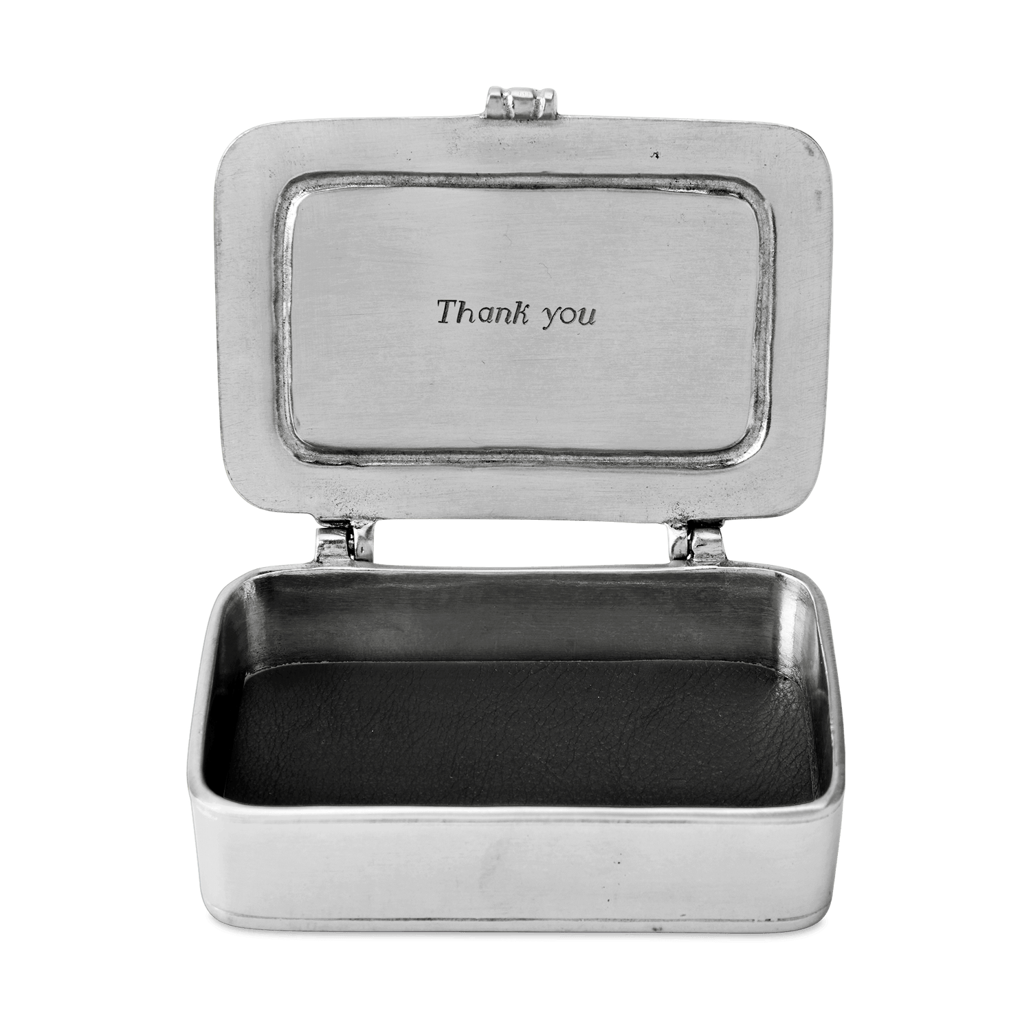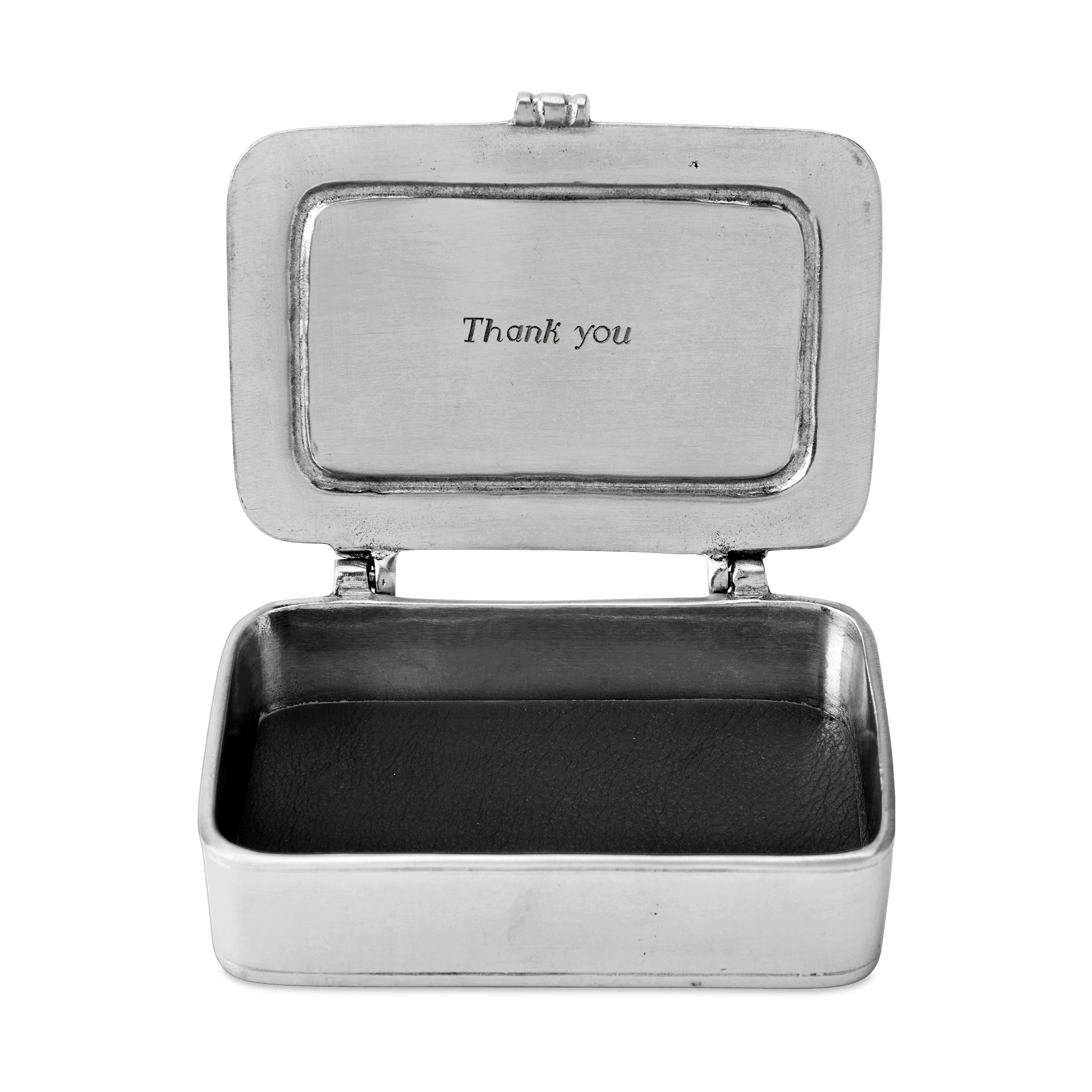 Engraved with “Grazie”, the Italian for “Thank You”, this gorgeous pewter box makes a thoughtful, heartfelt gift of gratitude that can always be kept close at hand. A perfect catch-all for everything from treasured keepsakes and jewelry to everyday essentials like paper clips. Available in two sizes and offered with an optional finely crafted leather insert in black or brown.