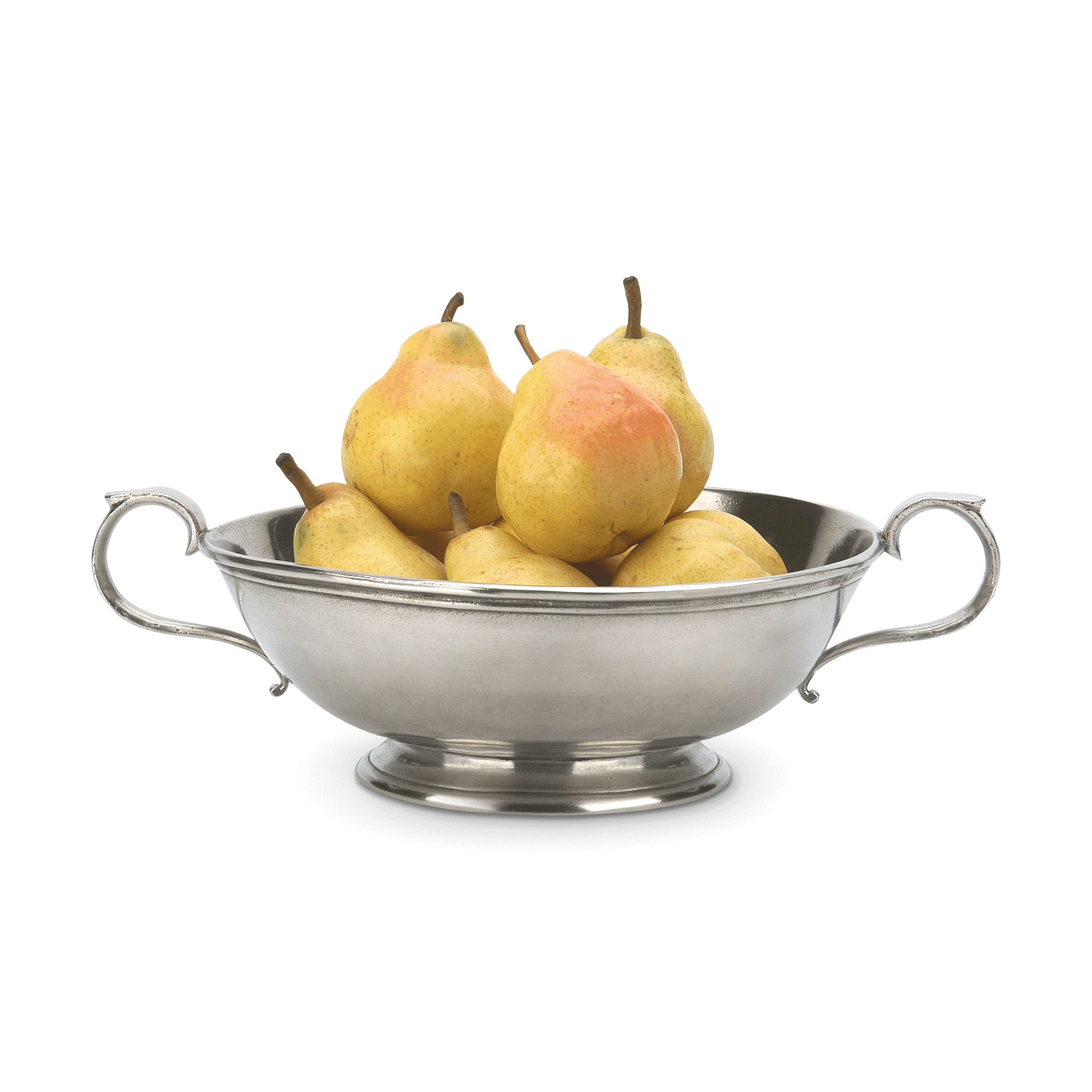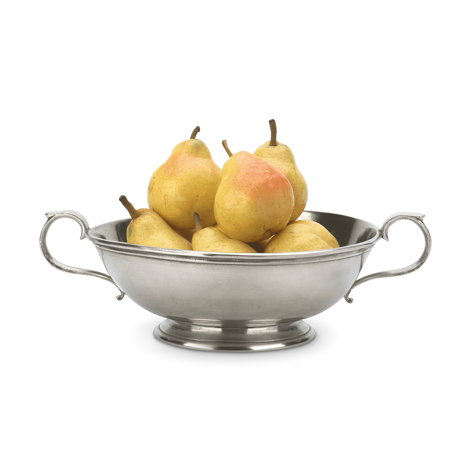 A small elegant pewter bowl with charmingly scrolled handles that we turn to time and again as a centerpiece to display seasonal flora or the pick of the day from the farmer's market.