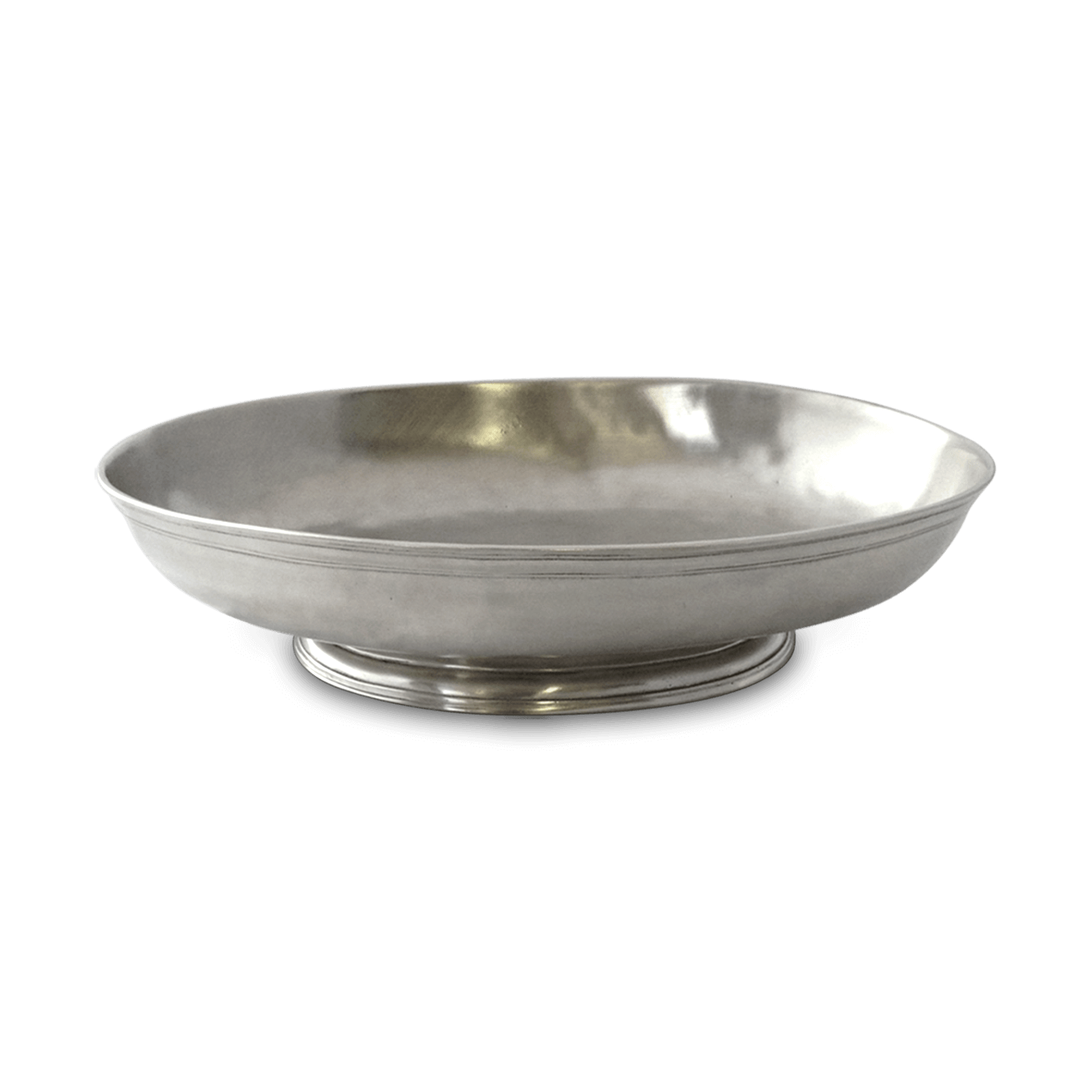 An exceptionally beautiful pewter centerpiece, styled to complement a variety of modern or classic settings. Its low profile makes it perfect for showcasing fresh fruit or dried gourds.