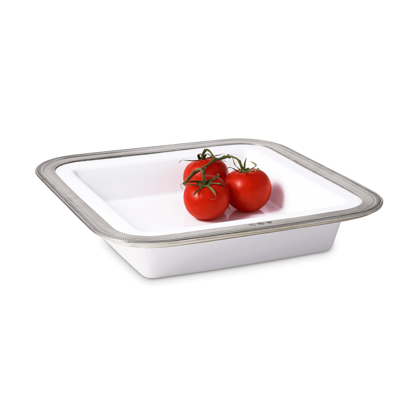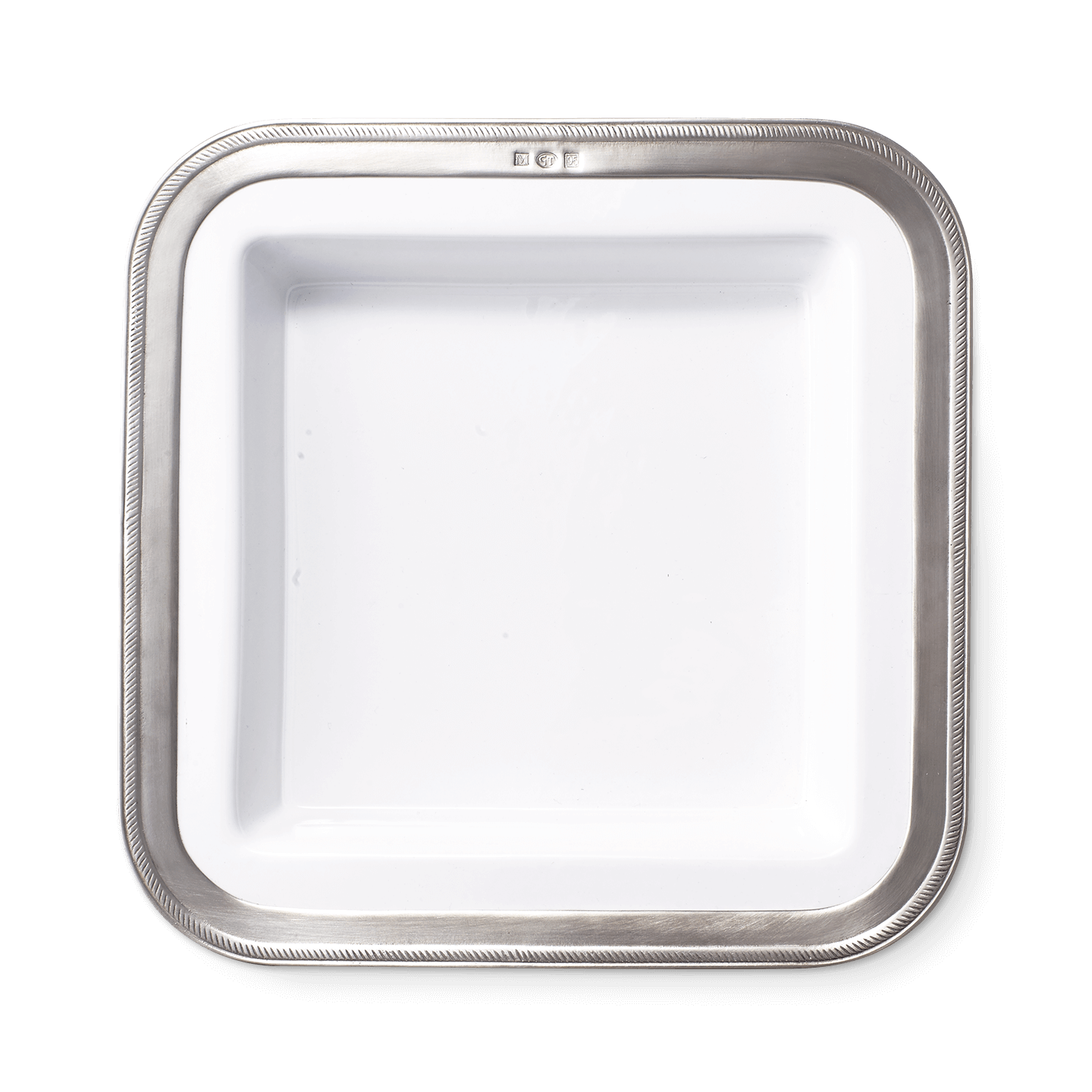 The Luisa square serving dish, made by hand, features a distinctive ceramic body and an Italian pewter rim elegantly engraved with a classic rope pattern.