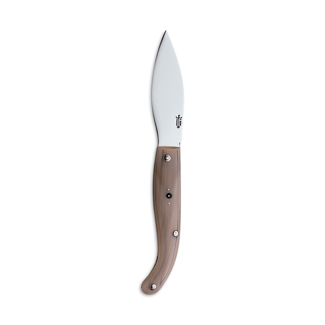 The handle of this Italian folding knife is crafted from a single piece of Ox horn, housing the blade with a simple spring-loaded closure. The iconic blade shape of the Berti Maremmano pocket knife recalls that of a leaf.