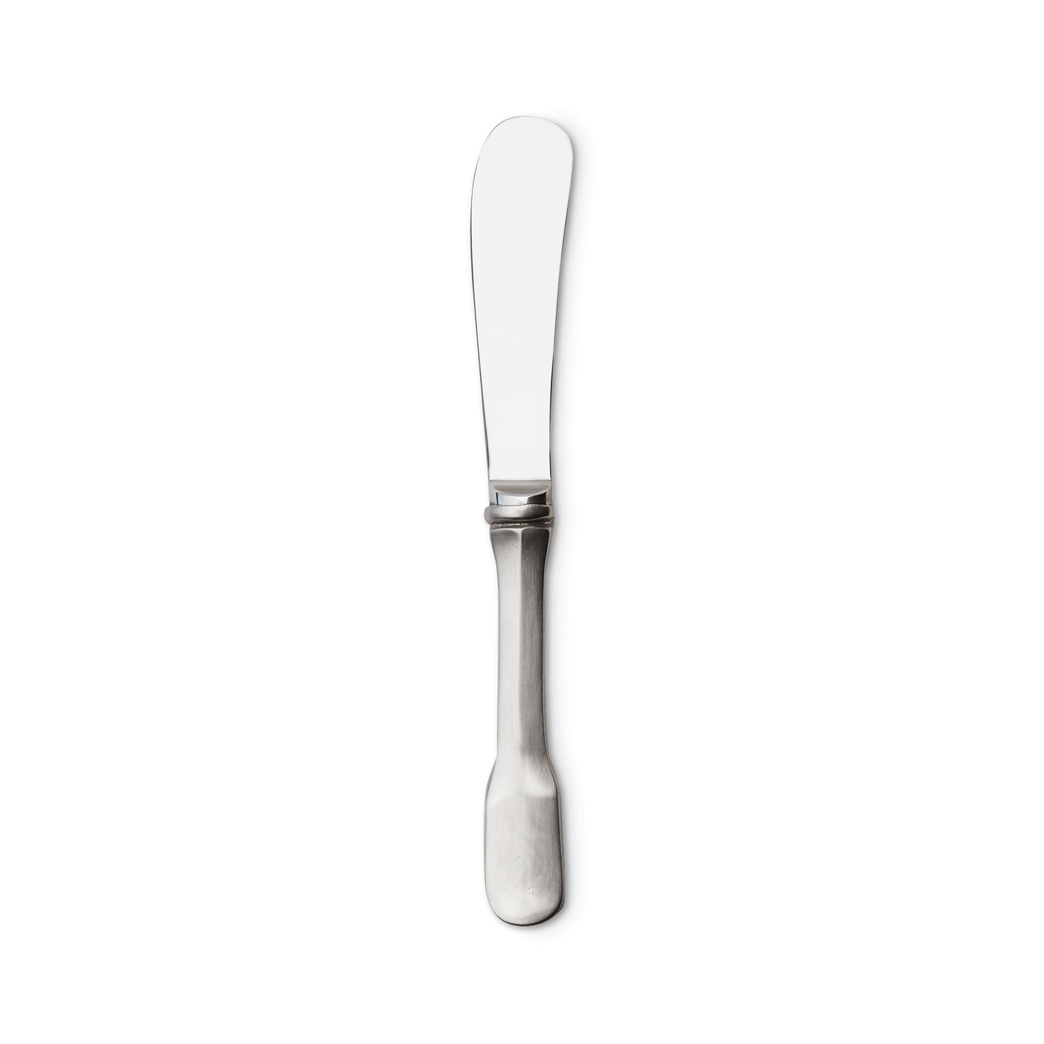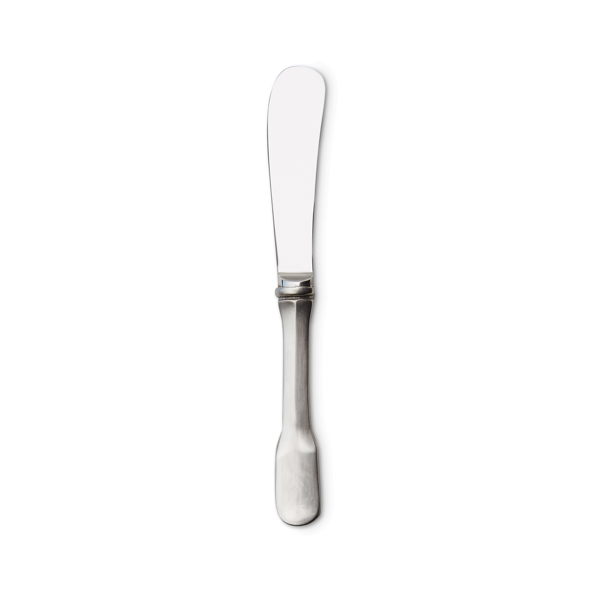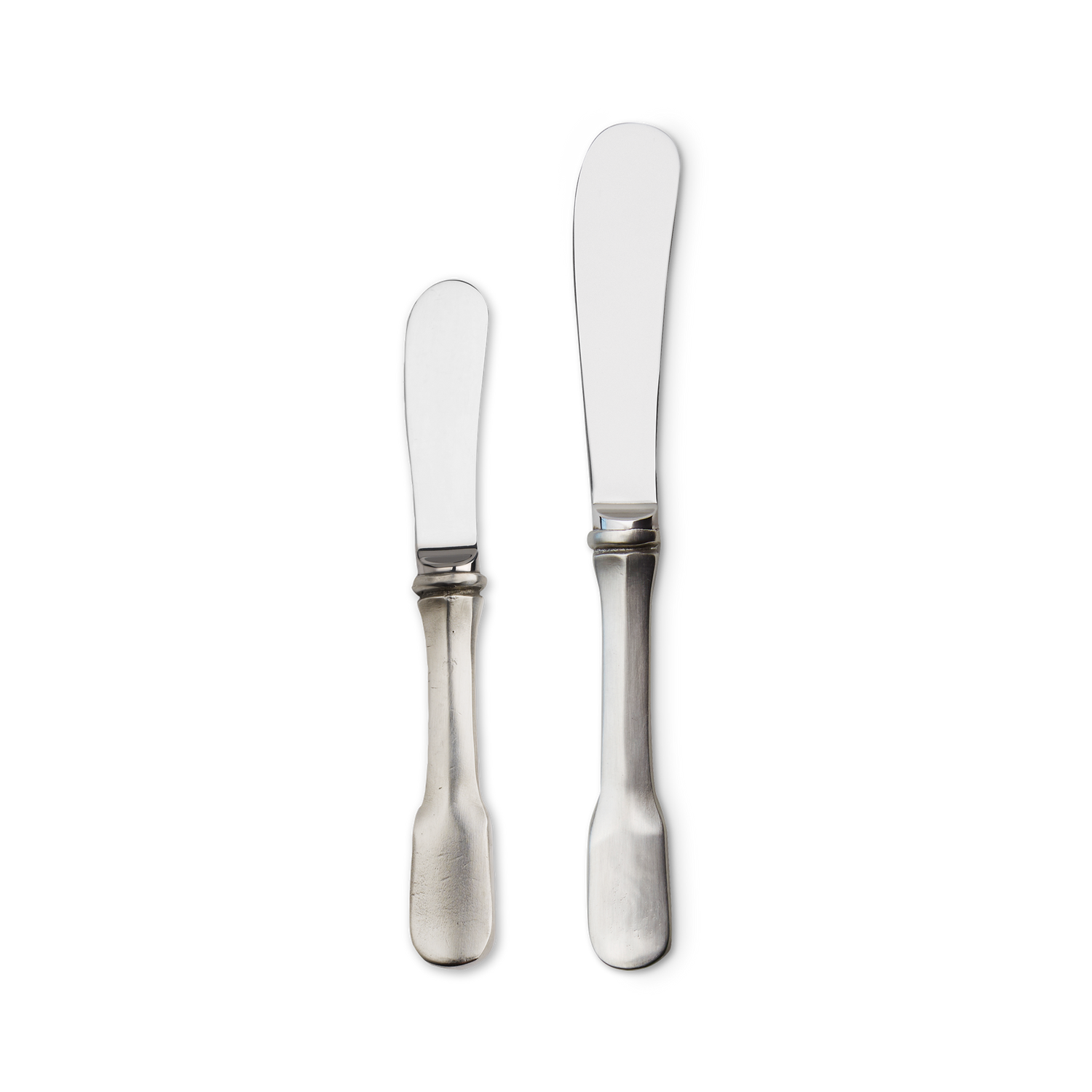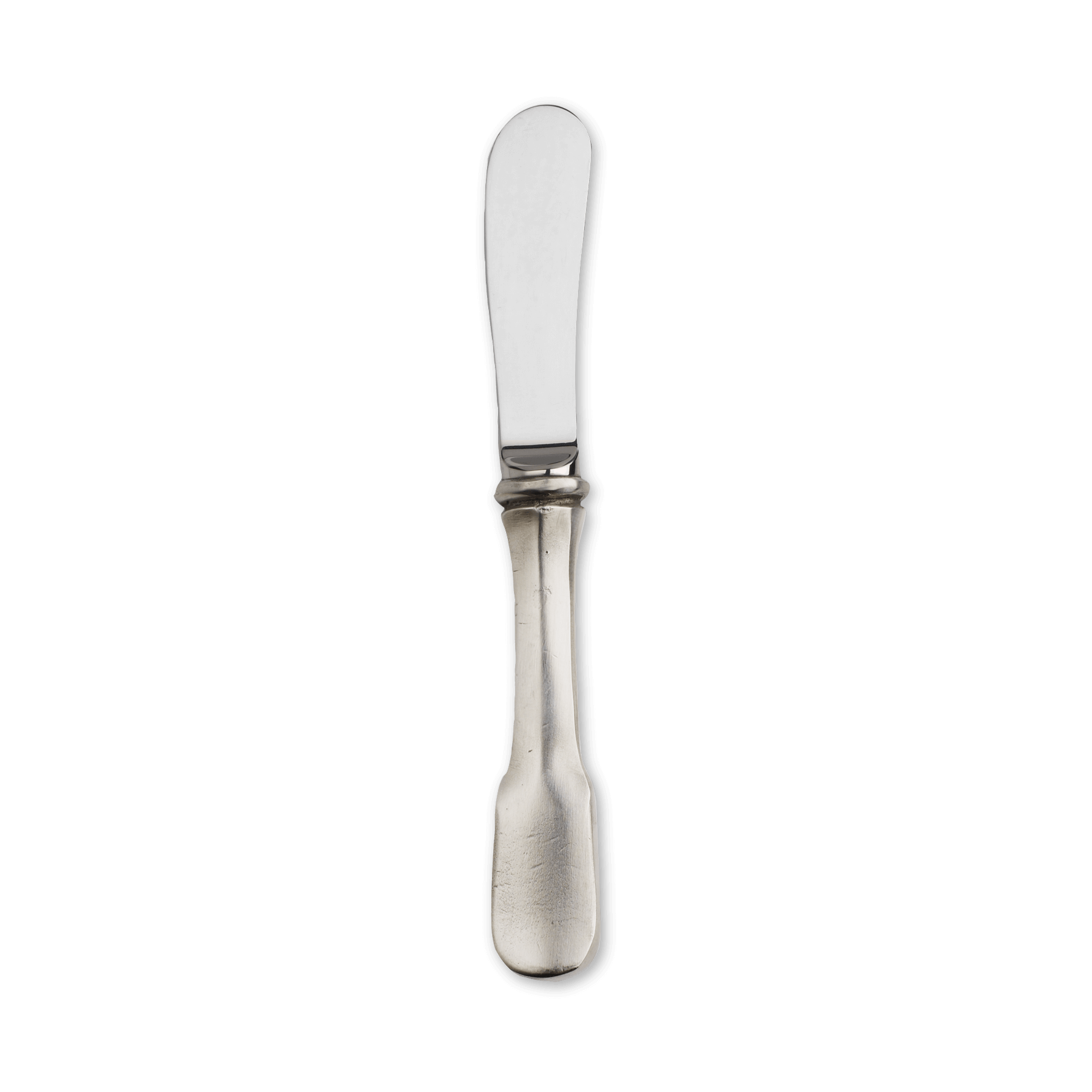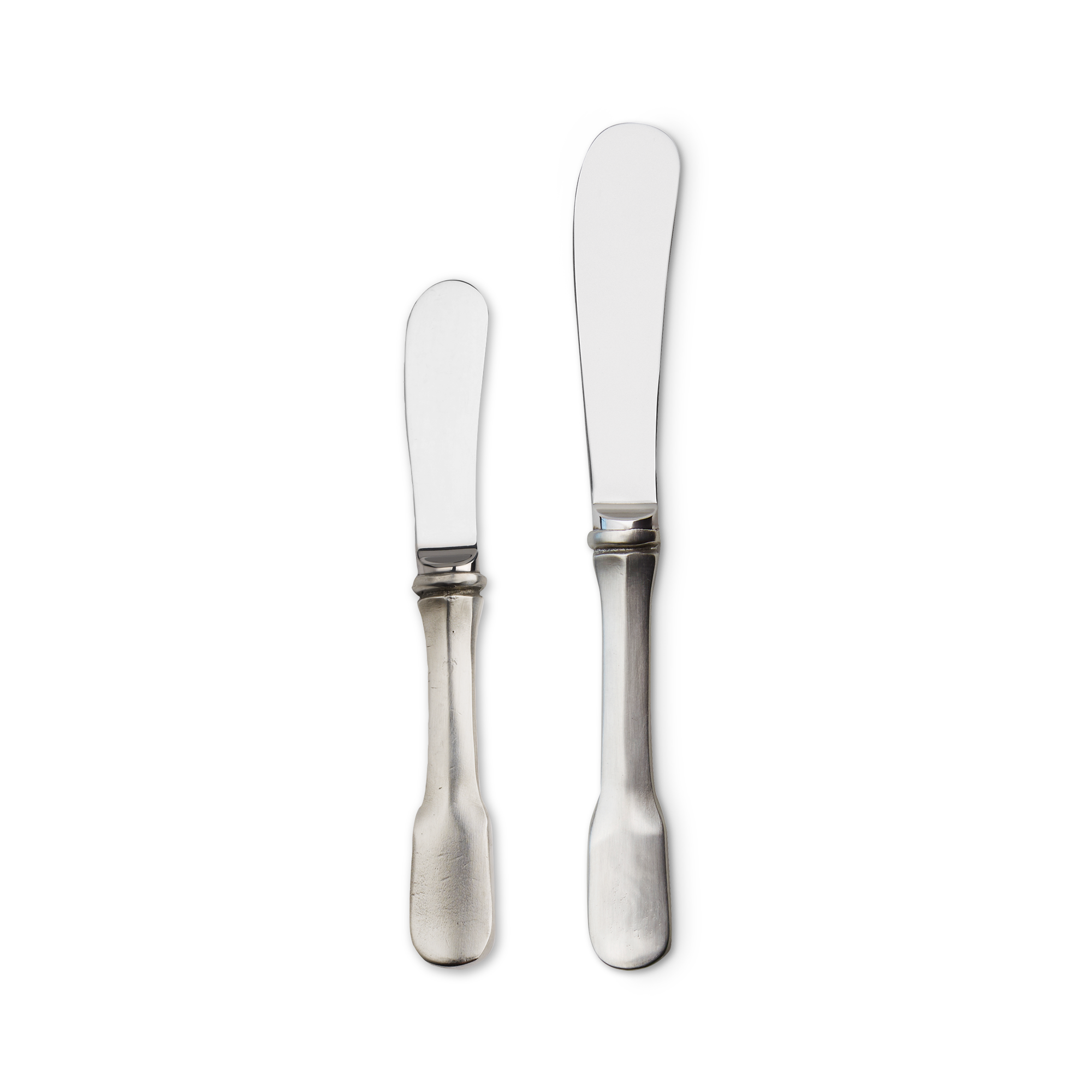 The Olivia flatware pattern boasts a handle style steeped in history, and dating back to the 17th century. Our take on classic fiddle pattern flatware, with an elegant flattened handle and round edges. The Olivia butter knife combines a pewter handle with a stainless steel knife blade. It's available in two sizes: the small is perfect for individual bread plates, the larger is best suited for a butter dish or butter dome.