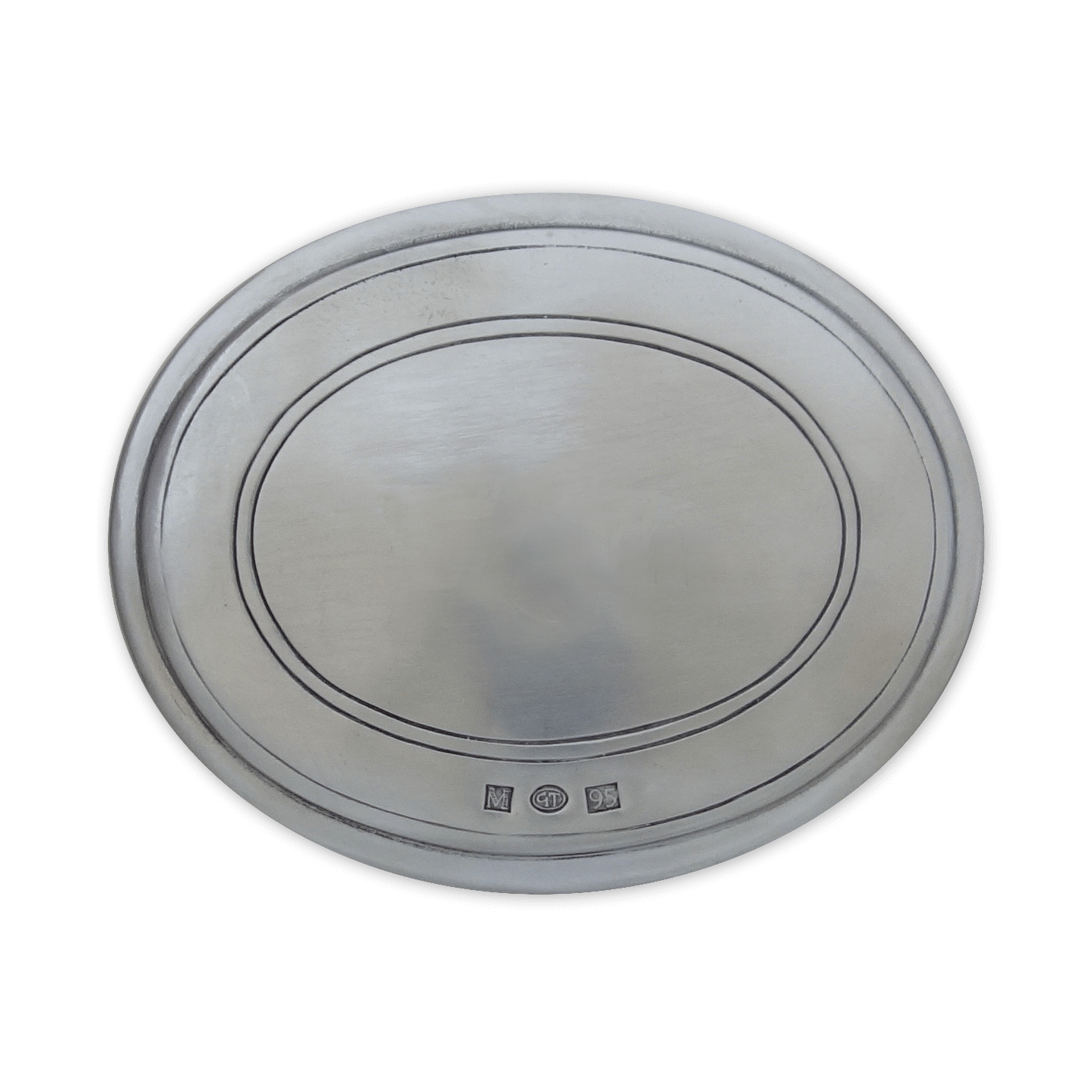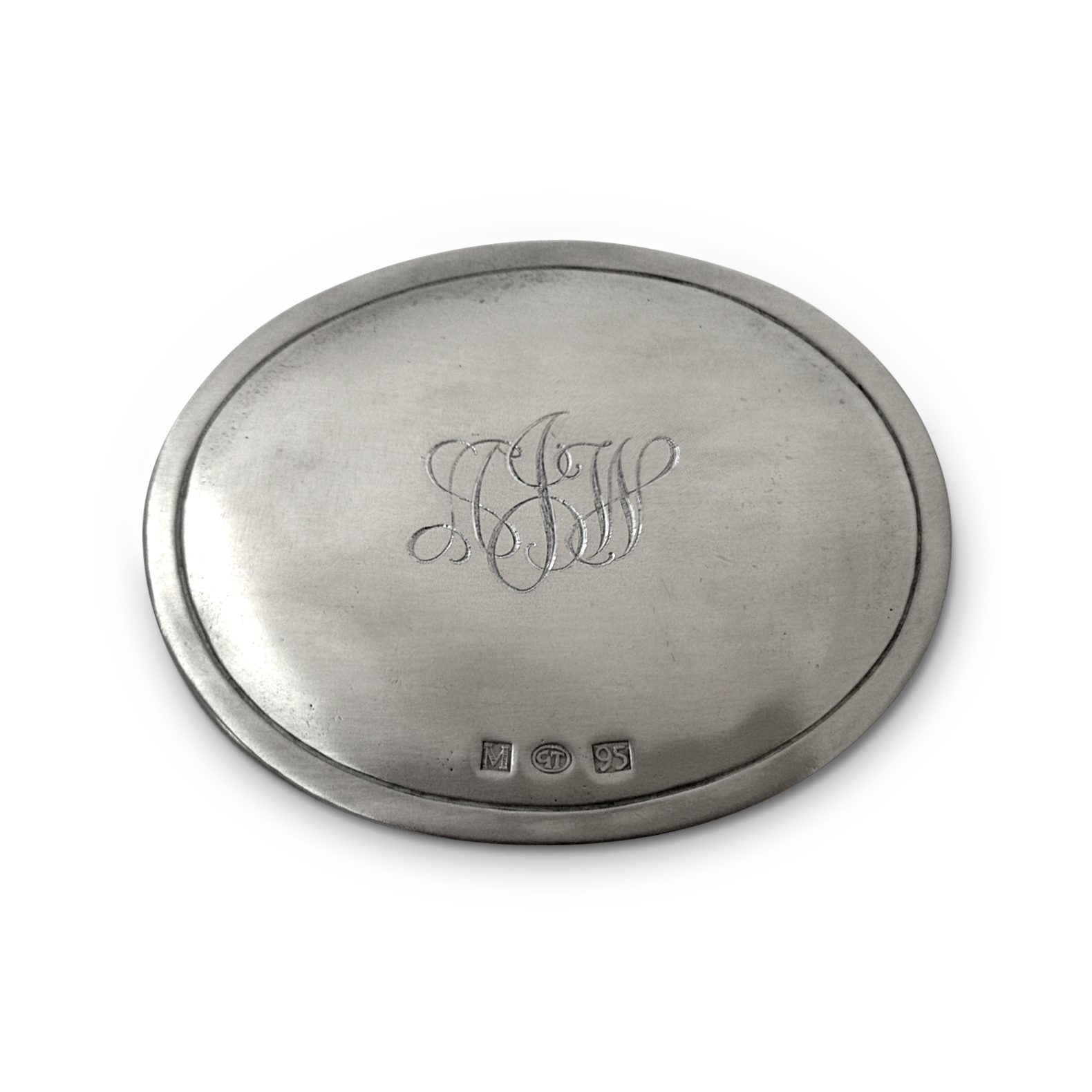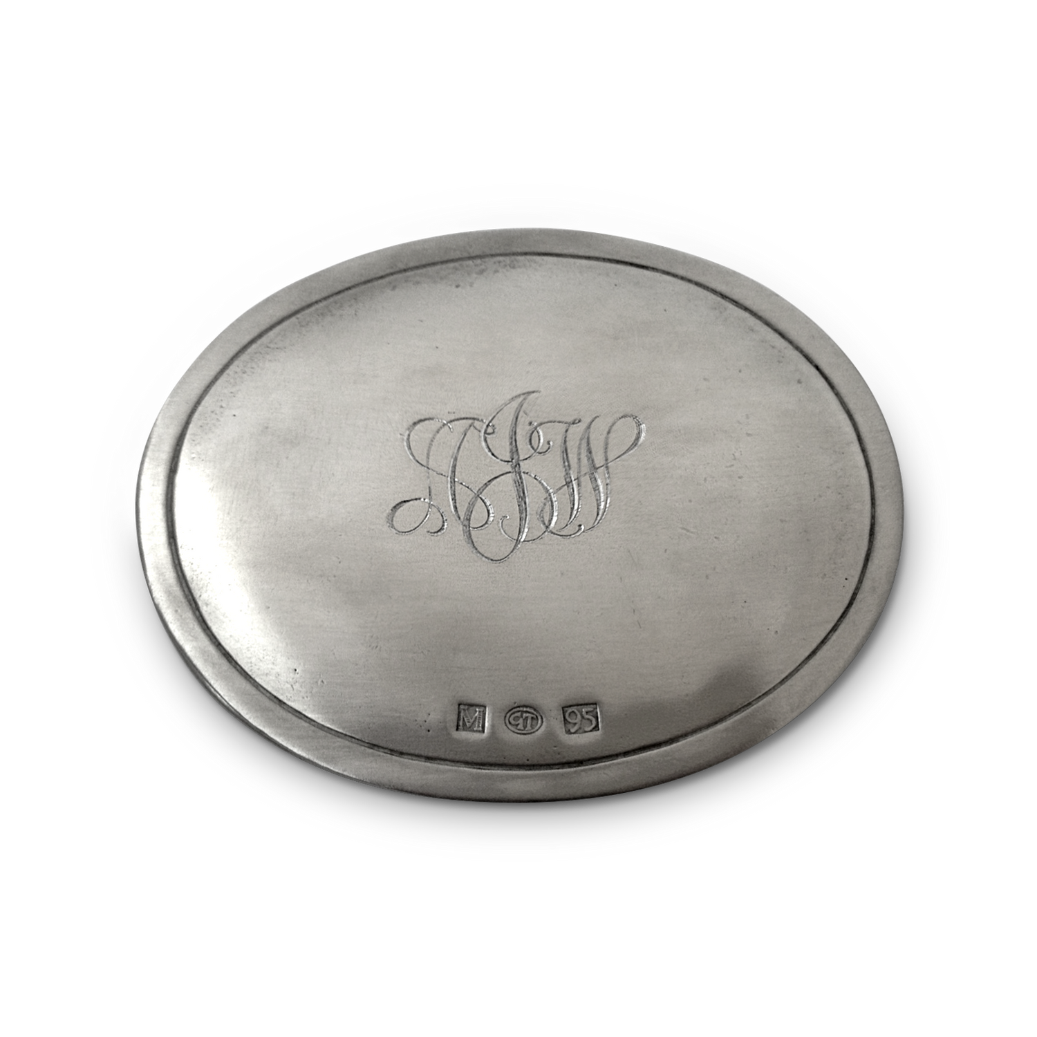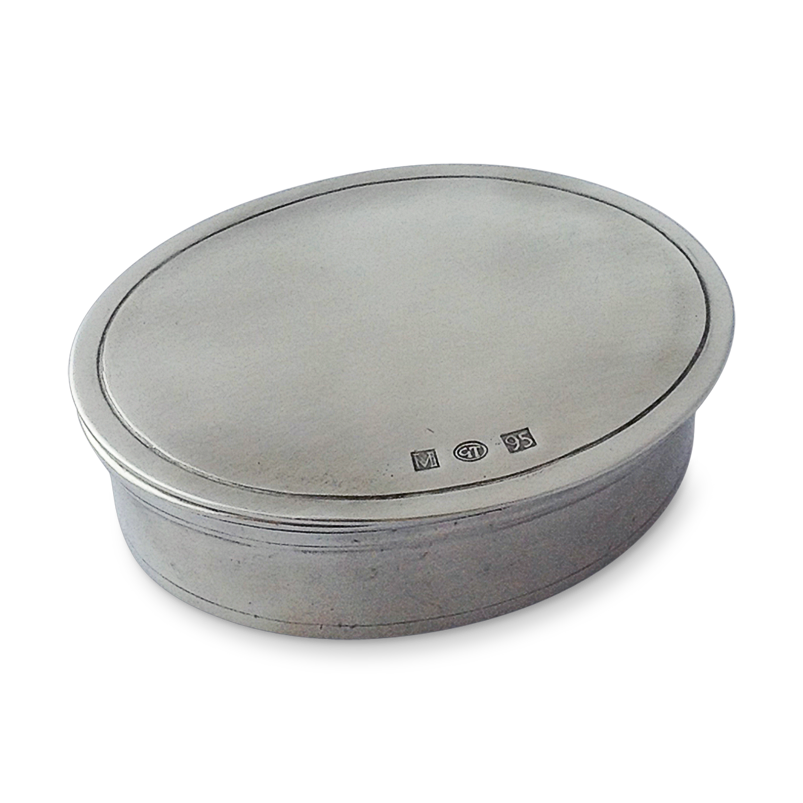 The elegant curves and graceful styling of this oval lidded dresser box blends perfectly in contemporary or traditional settings. The perfect catch-all for jewelry, small change, or your favorite sweets. Made from 100% Italian pewter.
