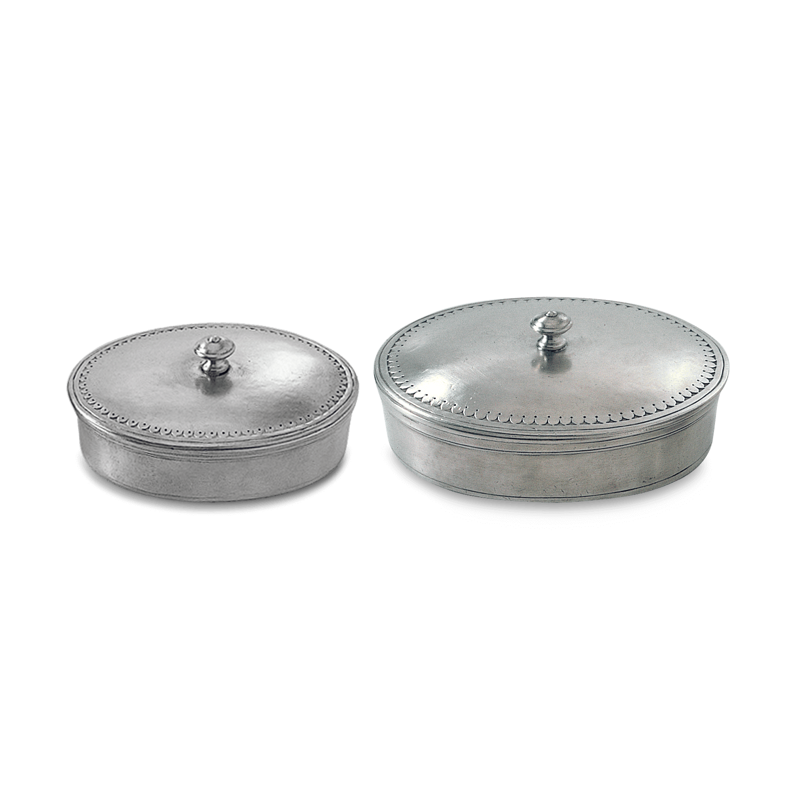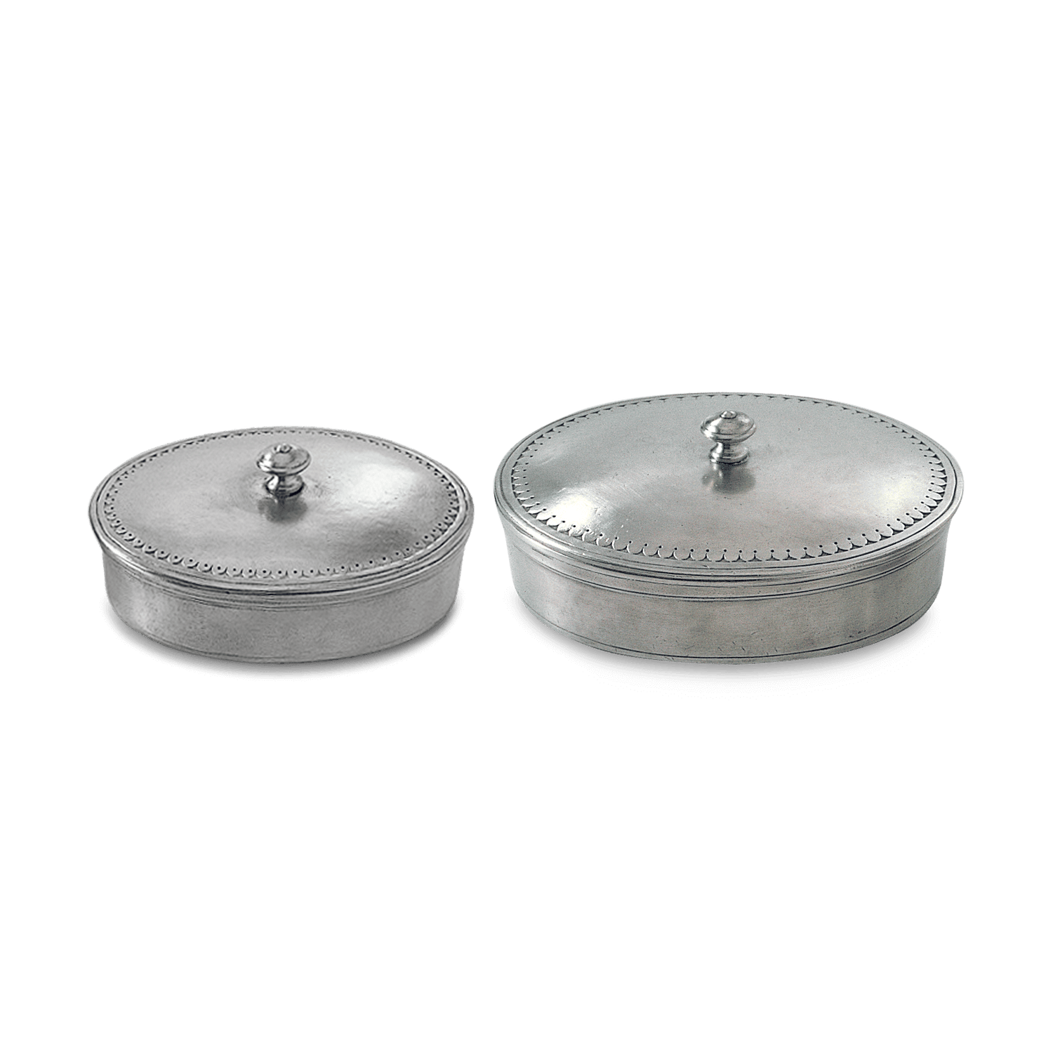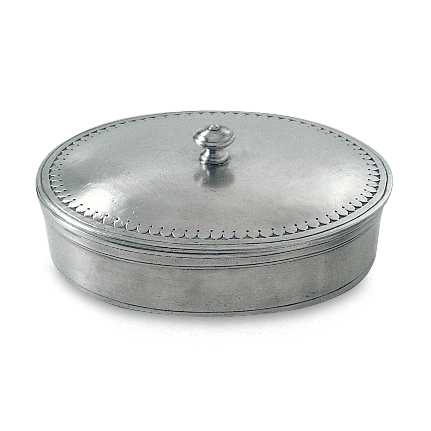 The refined classical details and elegant curves of this oval lidded box are well suited for a variety of contemporary or traditional settings. The perfect hideaway for small change, jewelry, or other keepsakes. Made from 100% Italian pewter.