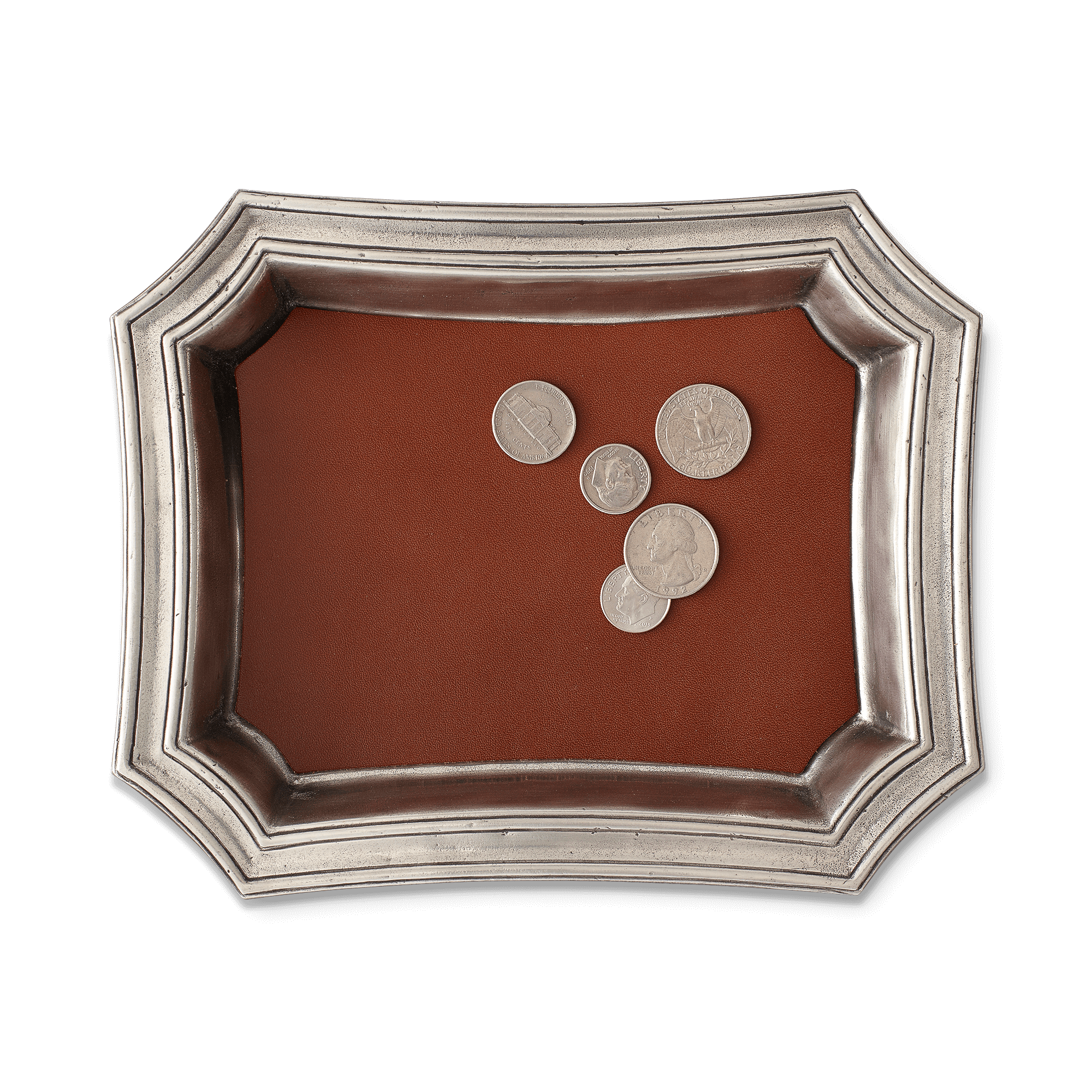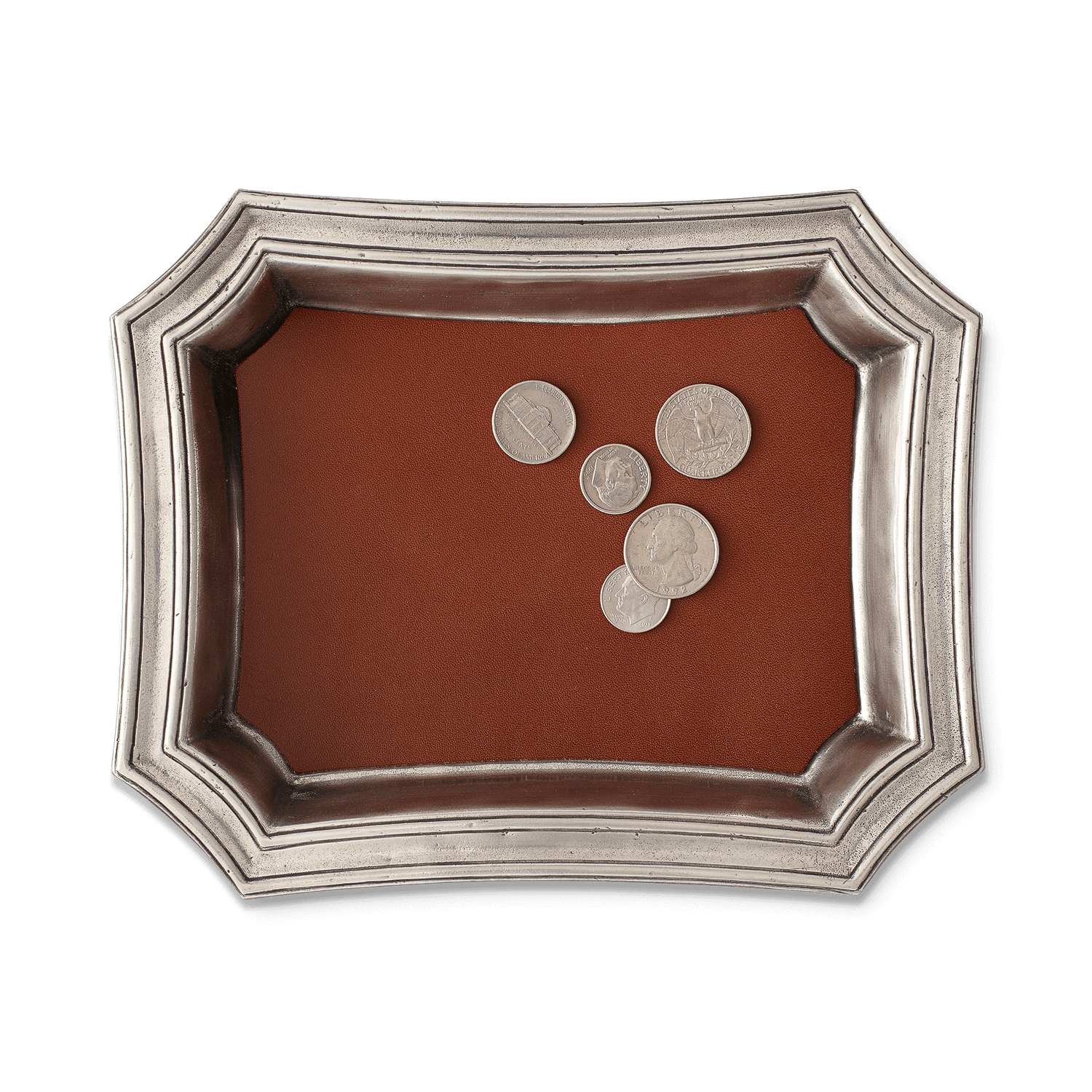 This handsome pewter pocket change tray with an optional brown leather lining is an ultra-versatile piece with an array of uses: some place it on an entry console as a handsome catch-all for keys and spare change, or on the coffee table for the remote controls, others find it perfect for the desktop, nightstand or dresser.