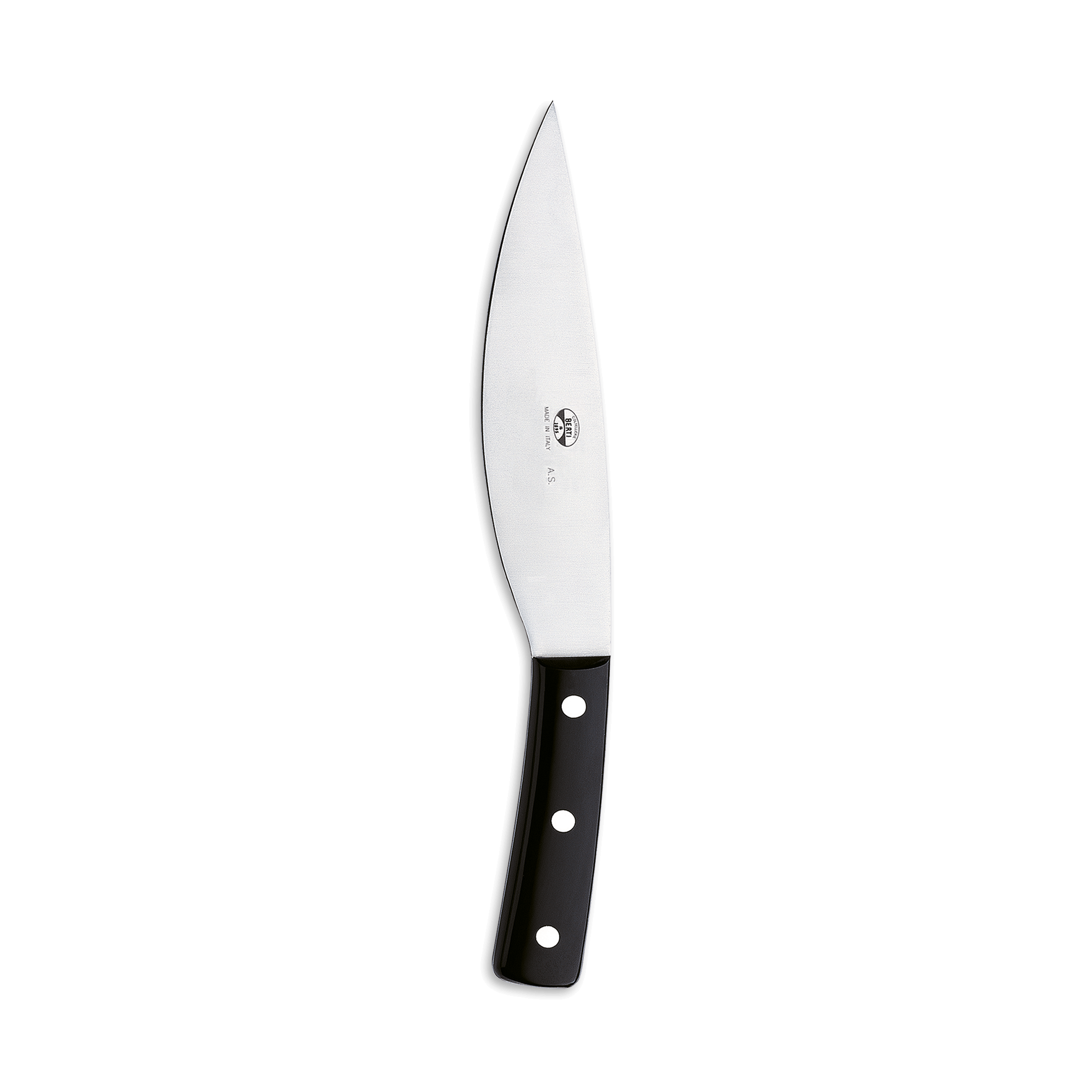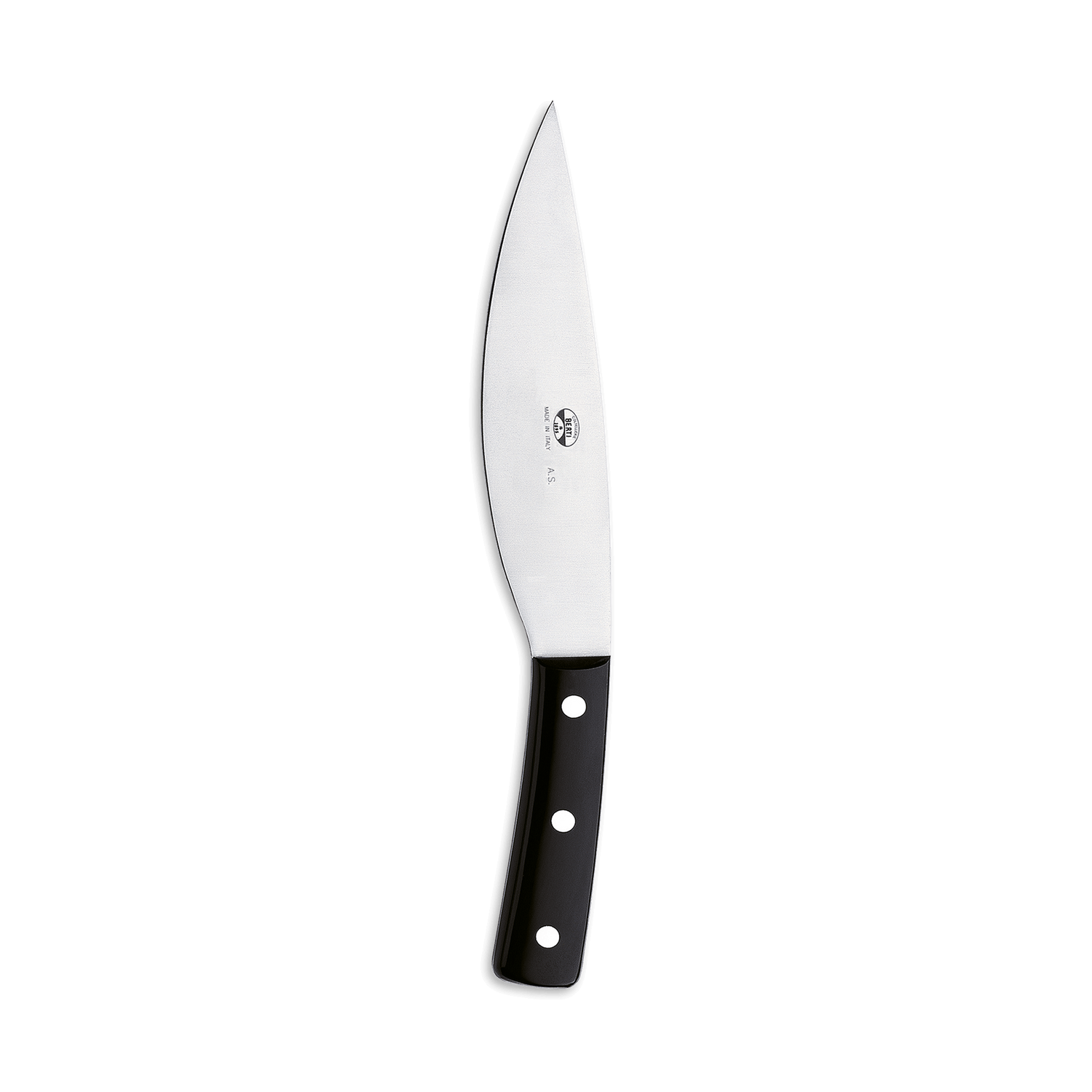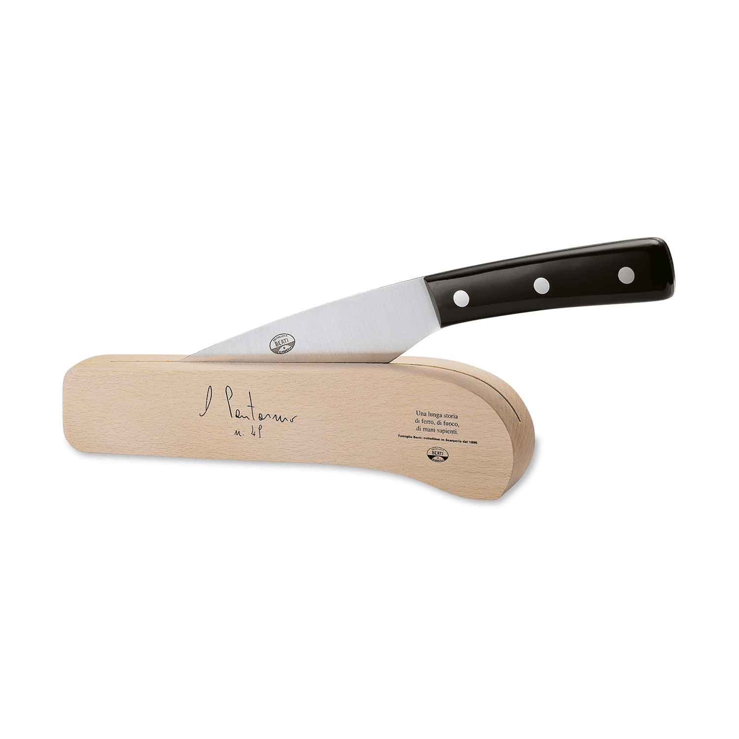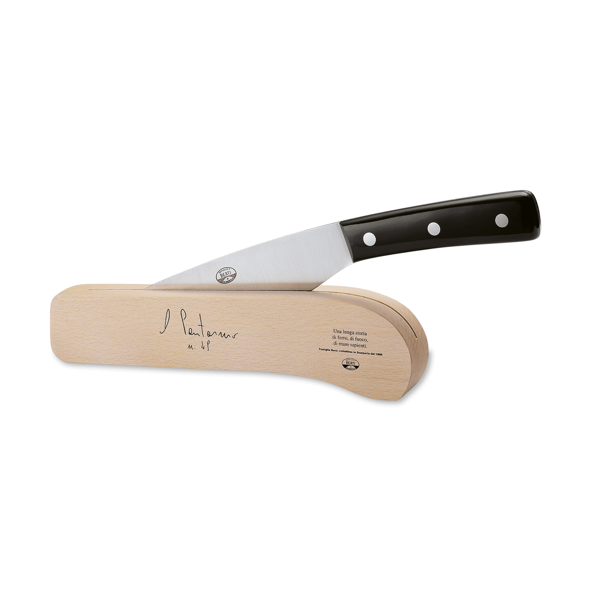 The laser cut, full tang Pontormo knife can be used for cheese, meat or vegetables. The angle of the blade allows for greater force with less effort. The rounded cutting blade can be used as a mezzaluna and the width of the blade allows for cut items to be easily picked up. Handle is made of Black Lucite and comes with a wood storage block.