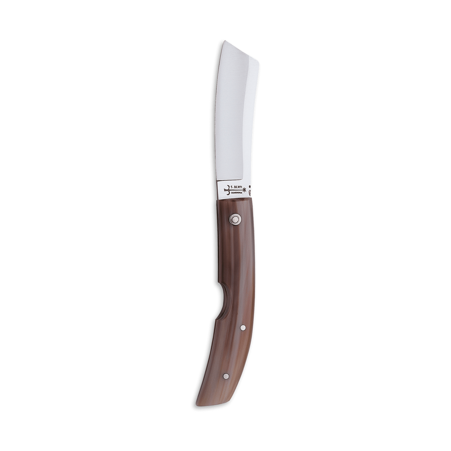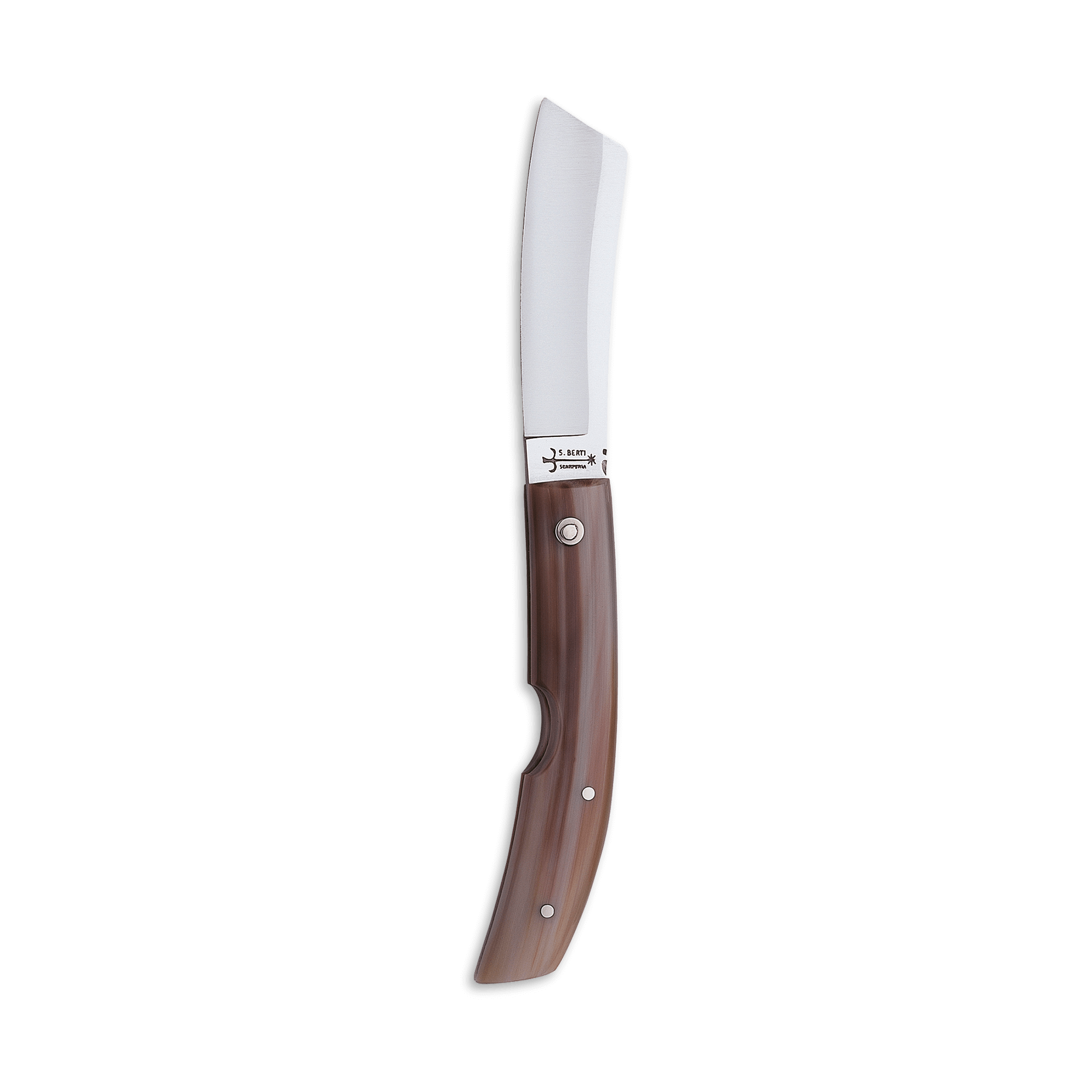The Berti Rasolino tagliasigari cigar cutter derives its name from its unique razor-shaped blade. The style of this folding knife became popular in Italy in 1908 after a law was passed that prohibited knives with a sharp end over a certain length. Housed in a elegant Ox horn handle polished to a mirror finish.