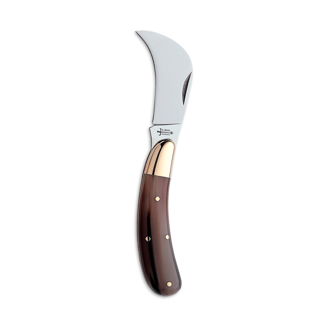 The folding blade of the Berti Roncola pocket knife features a classic foraging profile. An Italian regional knife traditionally used in vineyards for pruning and harvesting, it makes an ideal gift for your favorite mushroom hunter. Hand crafted and housed in an elegant Ox horn handle.