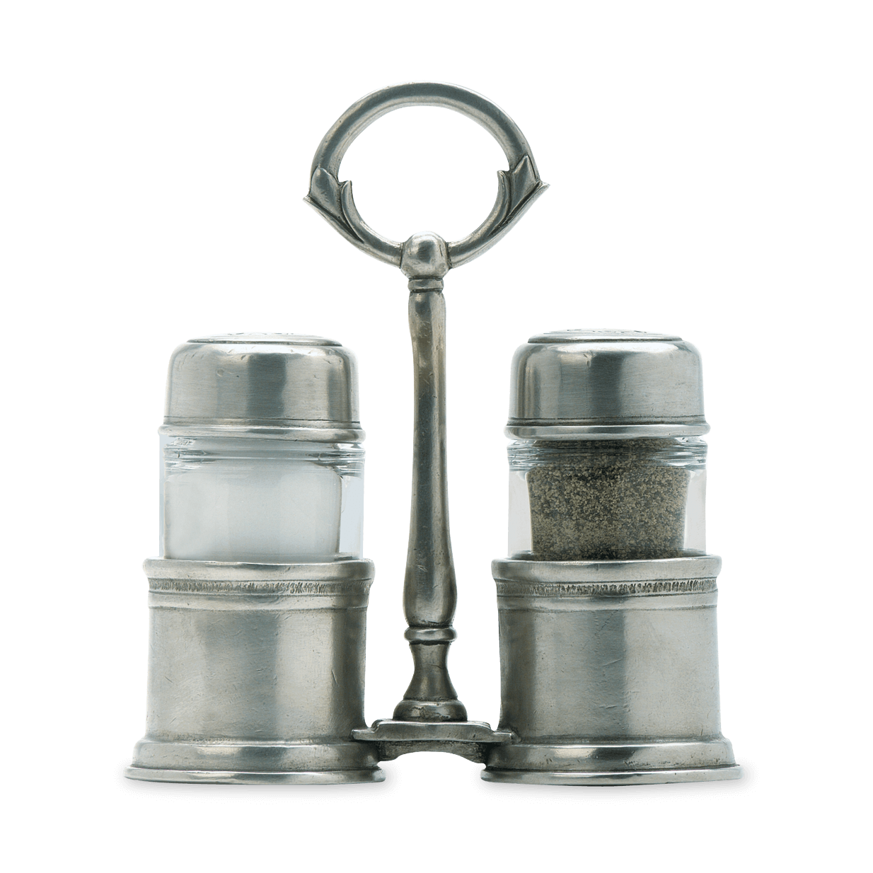 This salt and pepper caddy alleviates the separation anxiety that can arise when such necessities of daily life aren’t kept in one place. Each shaker has a removable pewter top, and the cylindrical glass body is dishwasher safe.