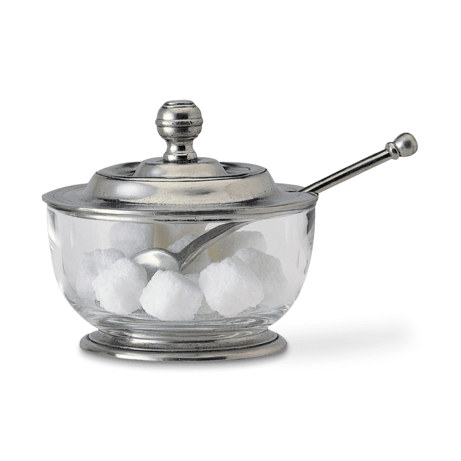 A sugar bowl is a staple of the morning table that's there to greet you every day. It should shine with some distinction. Our elegant sugar bowl paired with a petite spoon, is a charming marriage of glass and pewter that adds elegance to your most loved daily refreshments.