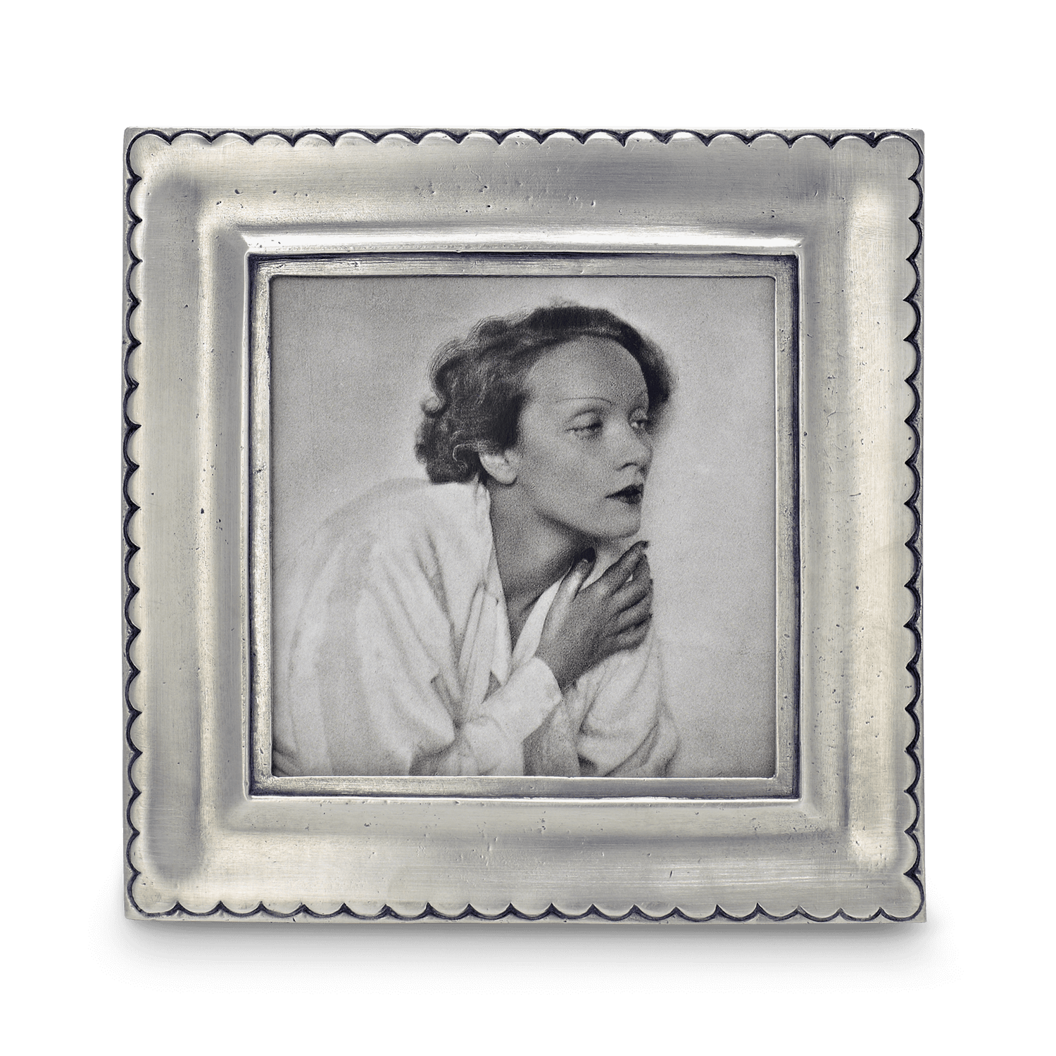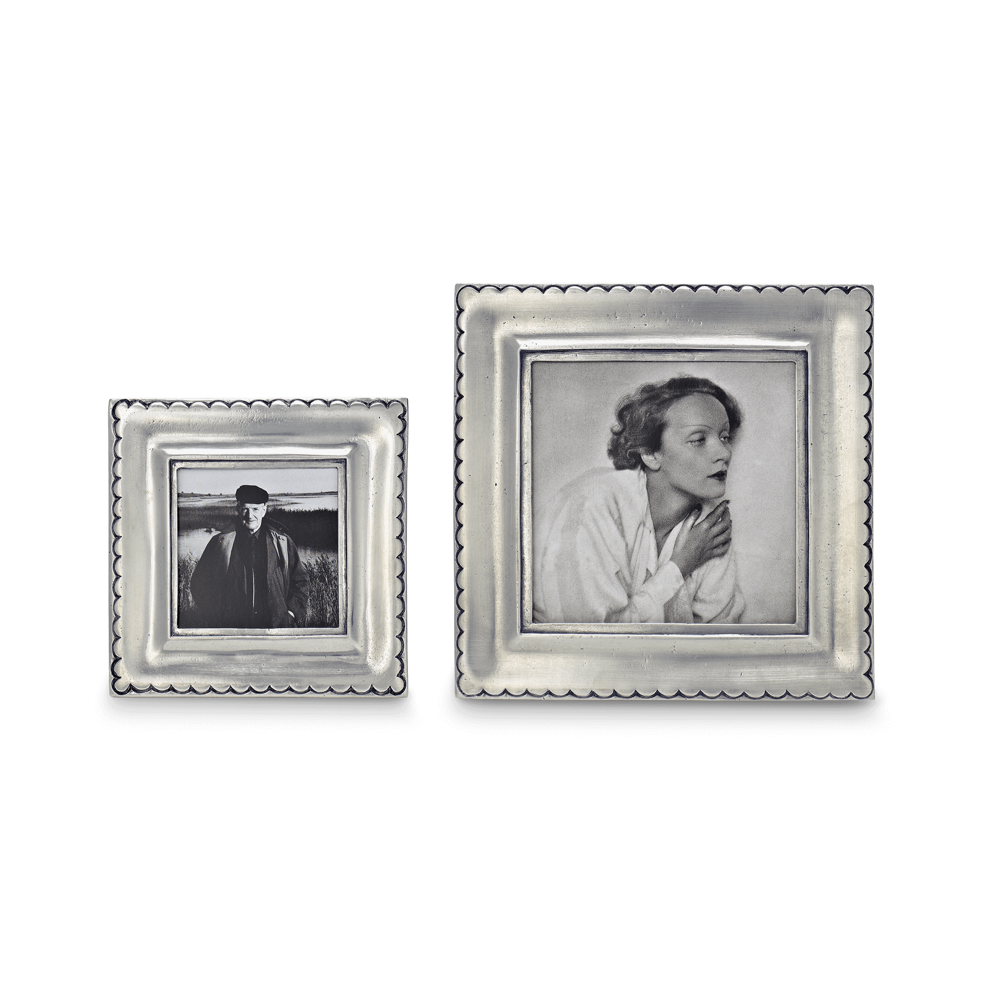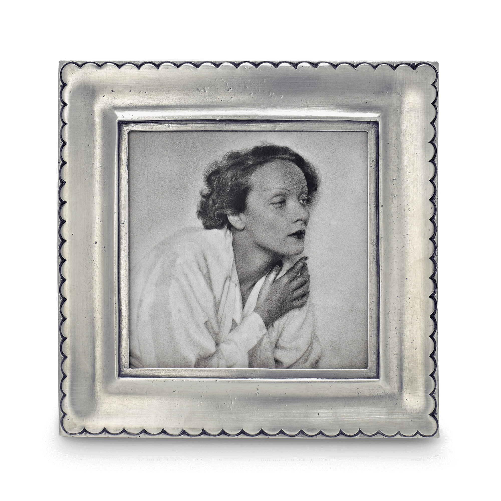 The snow covered slopes of Trentino, a region of northern Italy known for excellent skiing, inspired the scalloped edge of this collection of square pewter frames. Each of our frame collections was purposely designed to effortlessly display with the others, as we strongly encourage mixing different styles and shapes in your home or office.