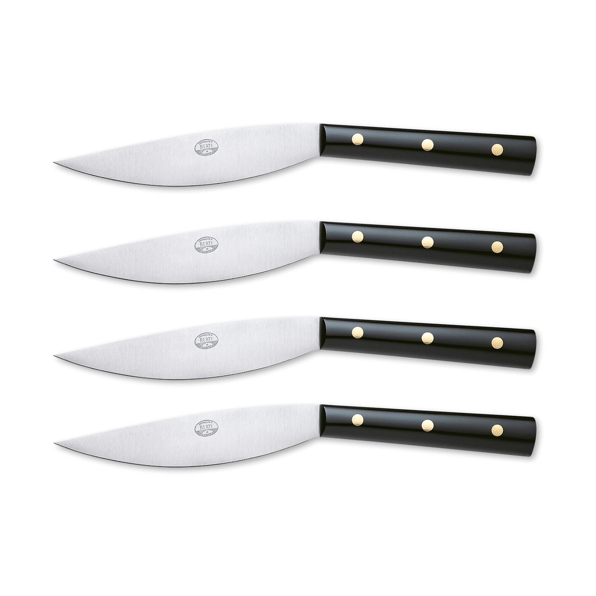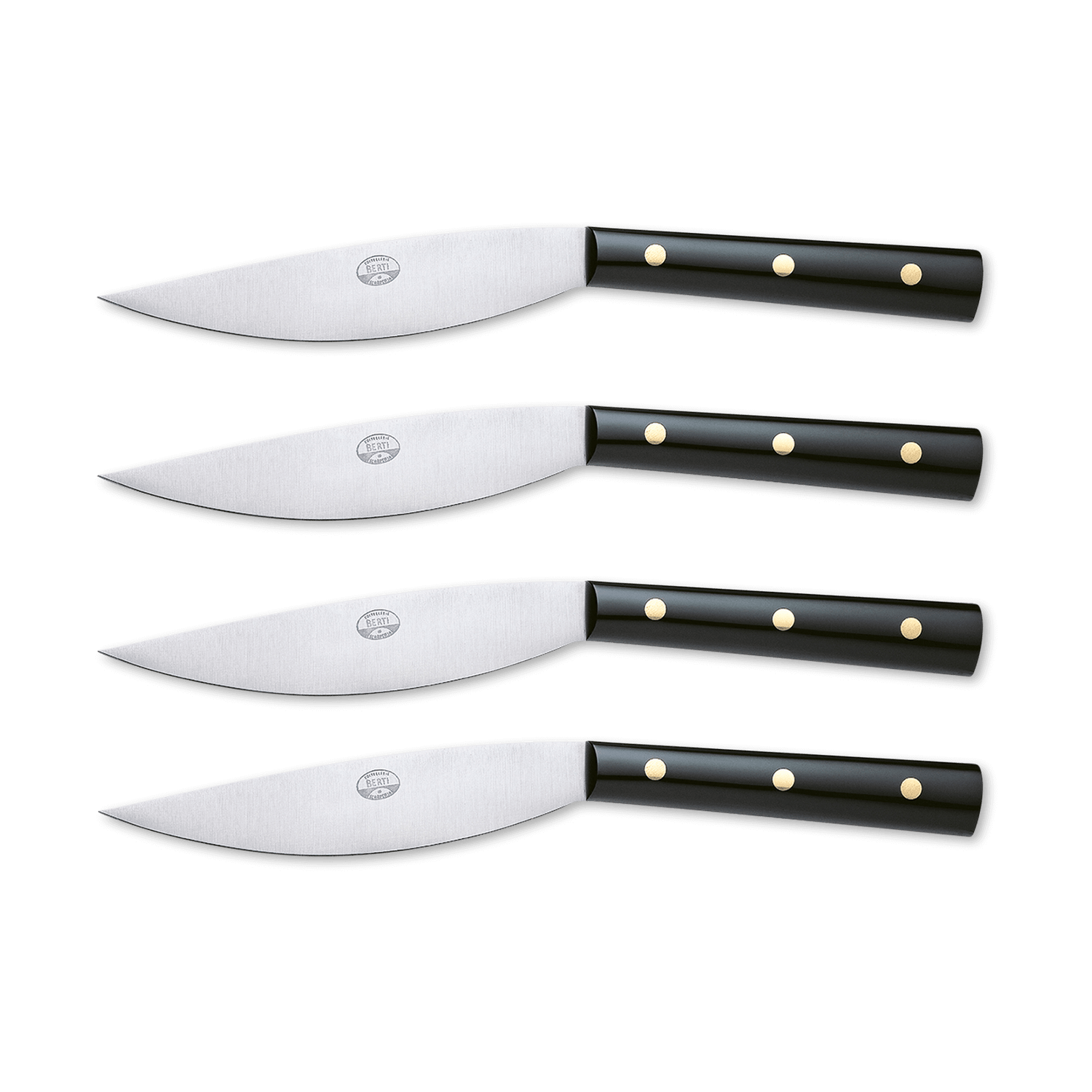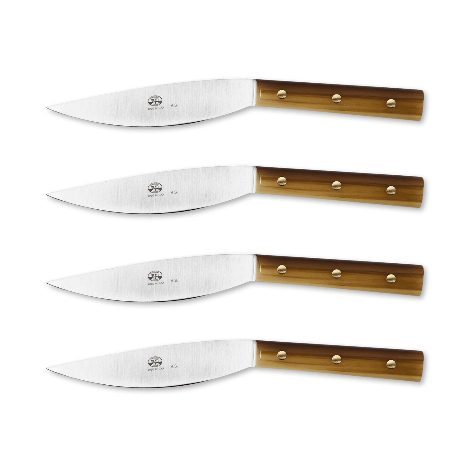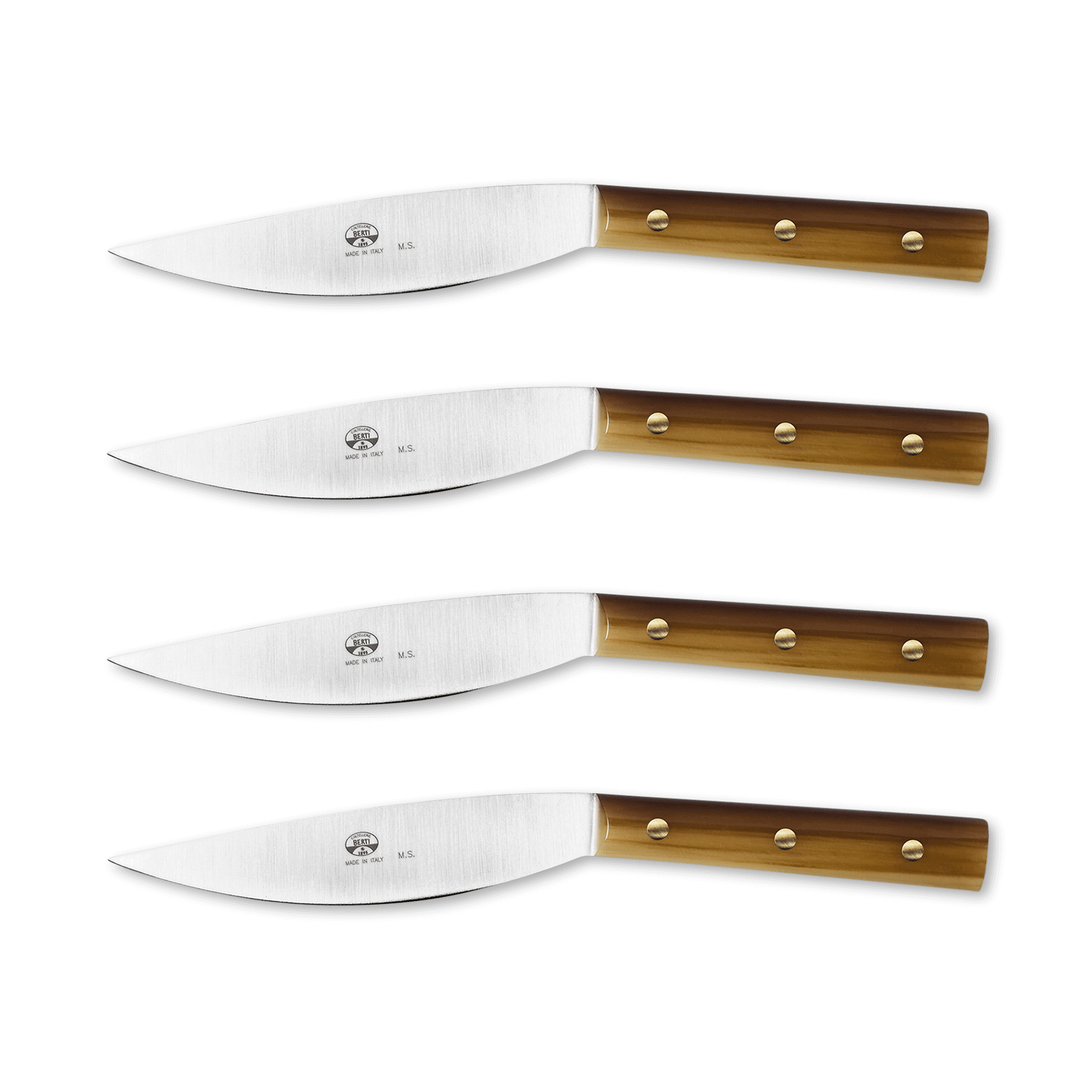 Berti's Valdichiana steak knives are substantial, precision cutting tools with a unique tilted contour that gives them greater stability and leverage in slicing. The stainless steel blade features a smooth cutting edge that avoids tearing the meat to preserve all the moisture and flavor, married to a lucite handle polished to a mirror finish. Handcrafted in Italy.