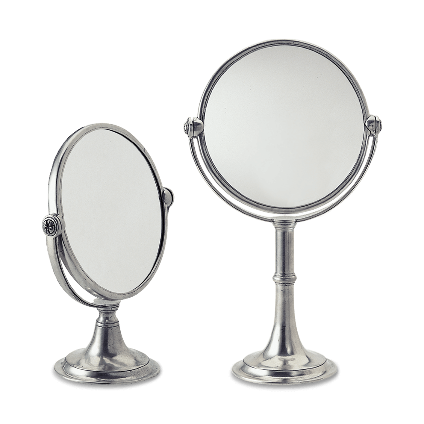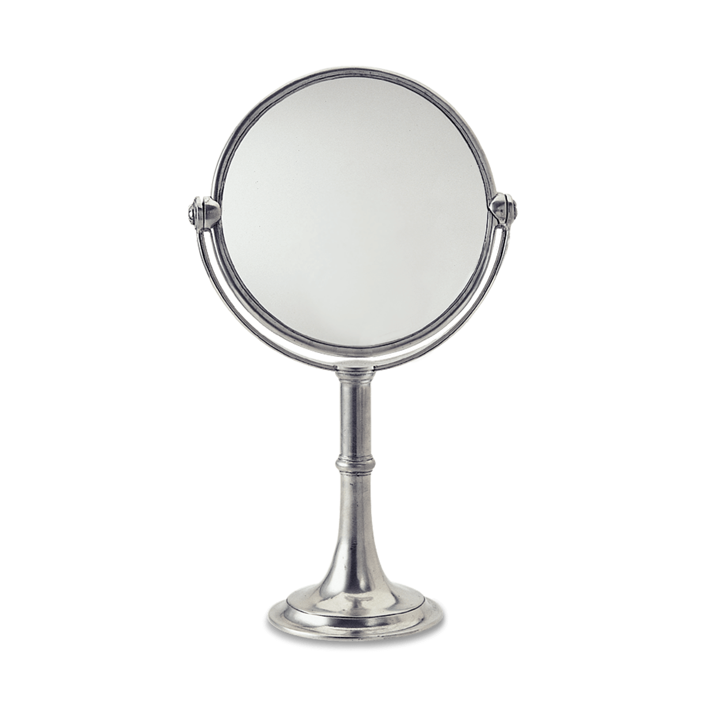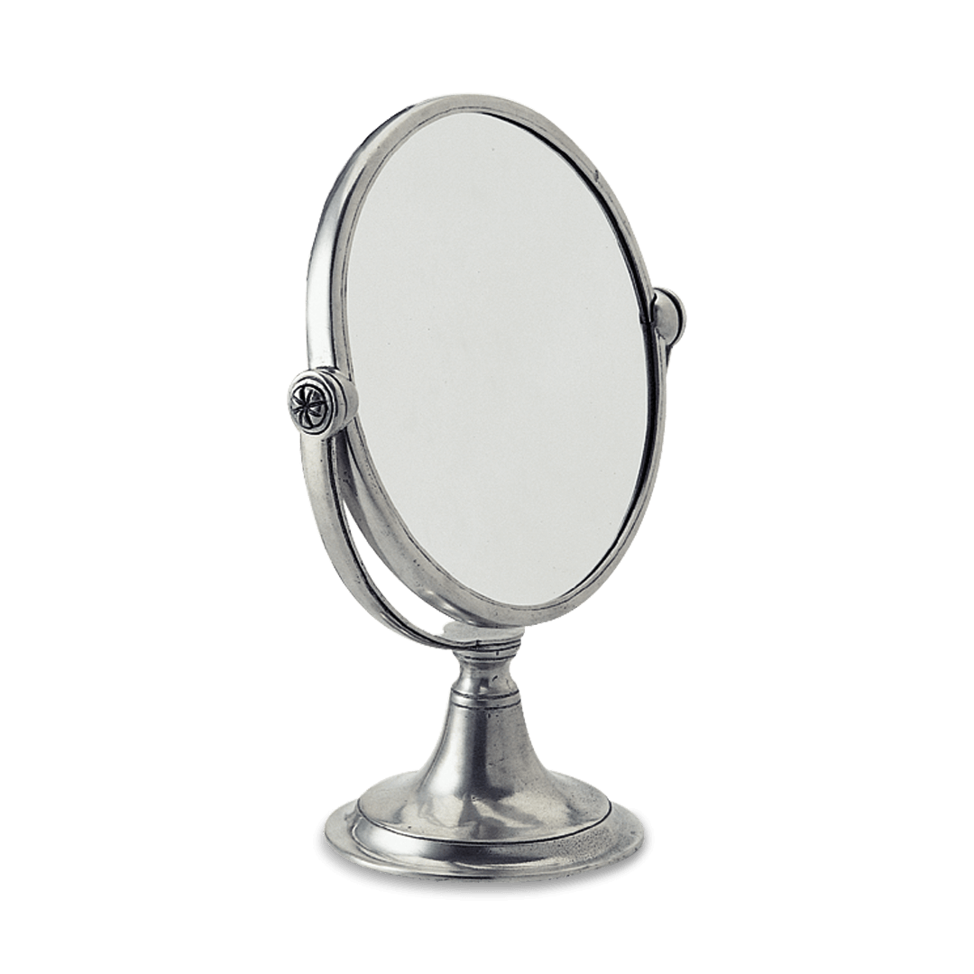 Double sided to bring out the real you! One side features 3x magnification. The perfect pewter vanity mirror for make-up, a close shave, or checking that winning smile.
