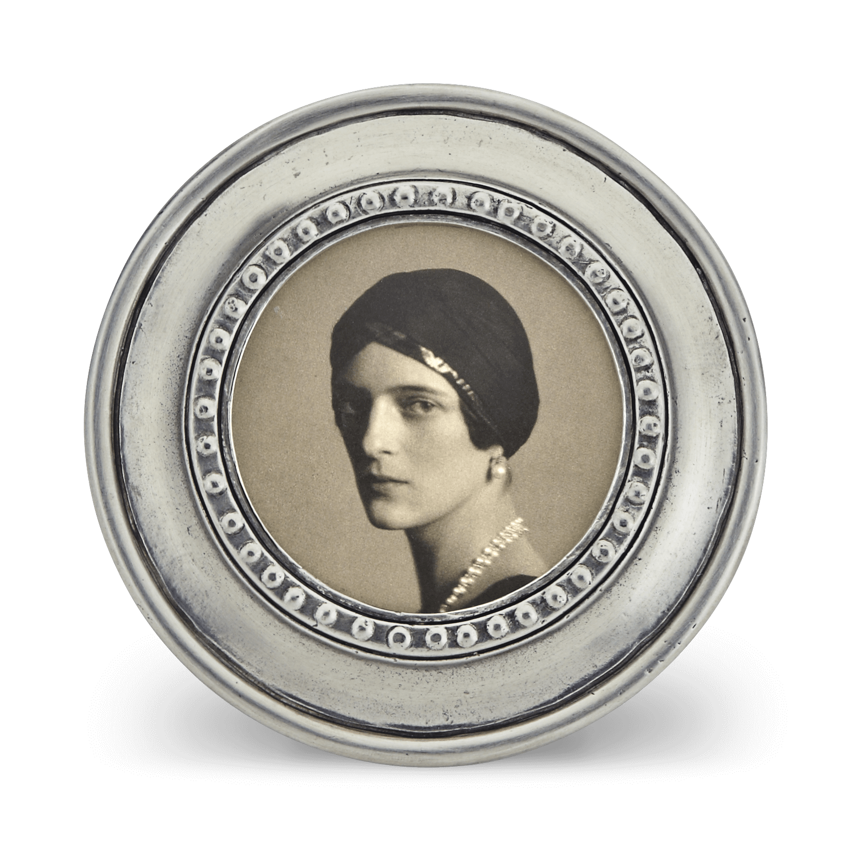 One of our more decorative styles, this Veneto round pewter frame features prominent beading which acts to visually bring the image forward. Finished with a handsome wood backing. We’re fans of frames as gifts, especially when personalized with your choice of monogram, message or memorable date.