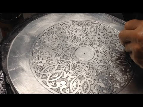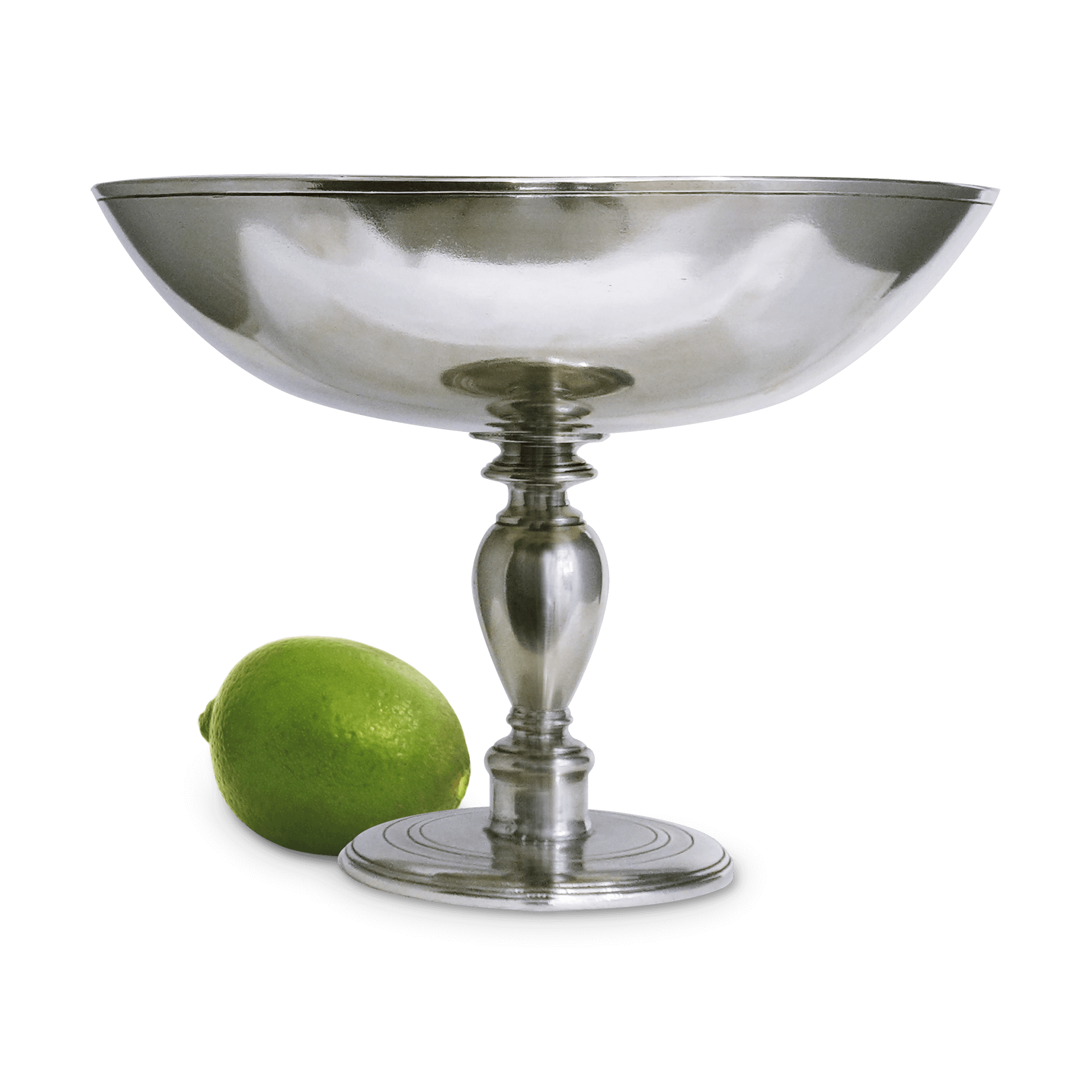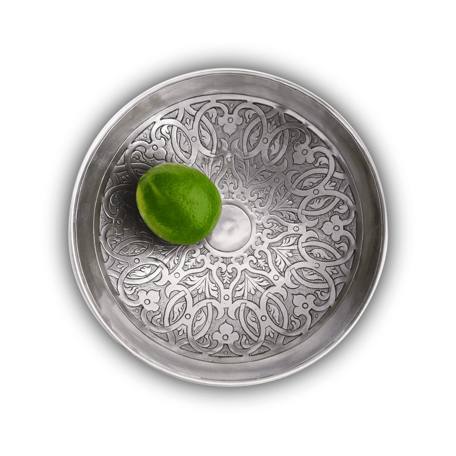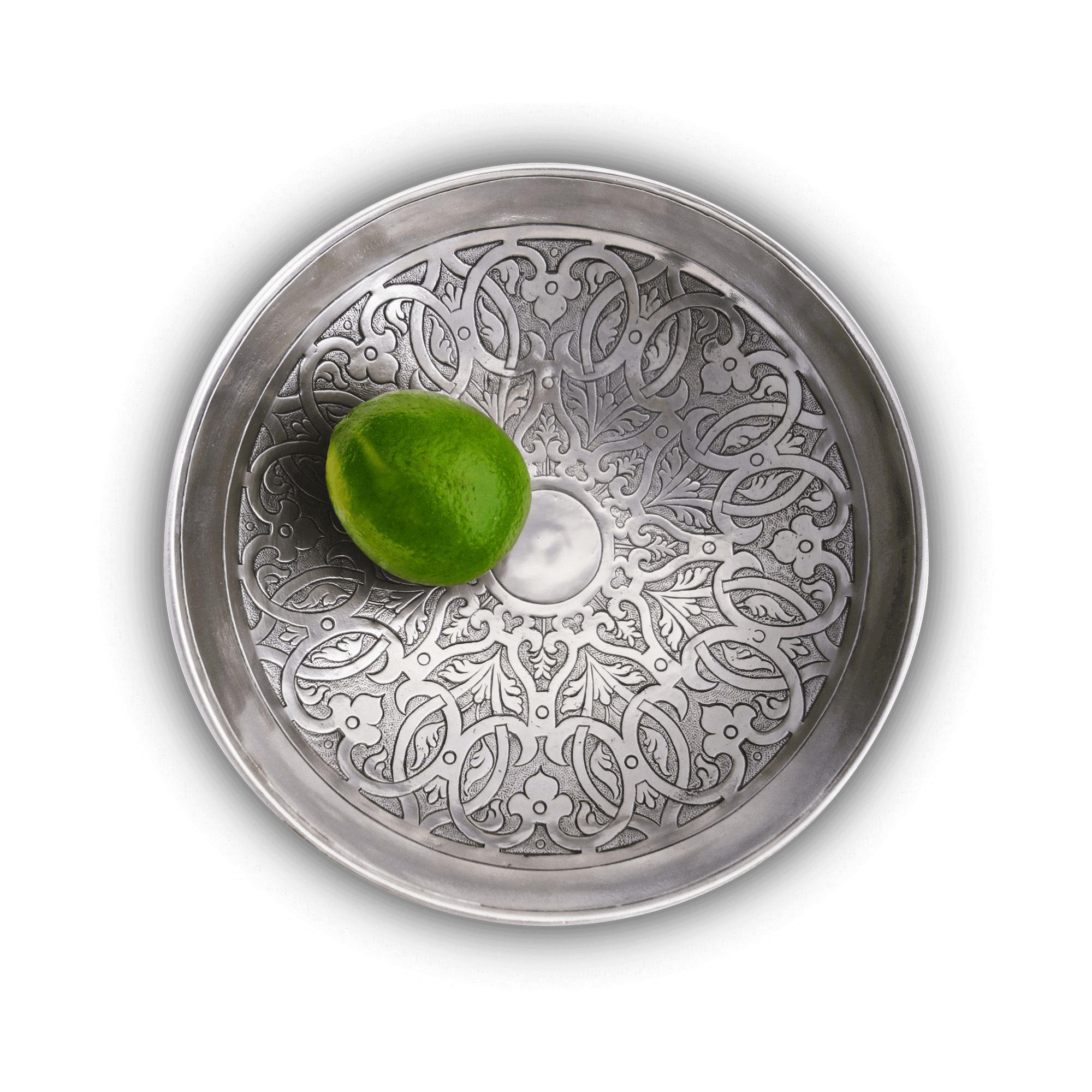 The Venezia pewter pedestal bowl is a bit of a departure for MATCH because it is the first time we have used an engraved design within a bowl. In the accompanying video you’ll see a craftsman in one of our Italian workshops creating the final pattern. First, the design was hand-drawn, and transferred to the disc. Then, over the course of a day and a half, he painstakingly engraved the design. When finished, it was used to create the mold from which the bowls are made.