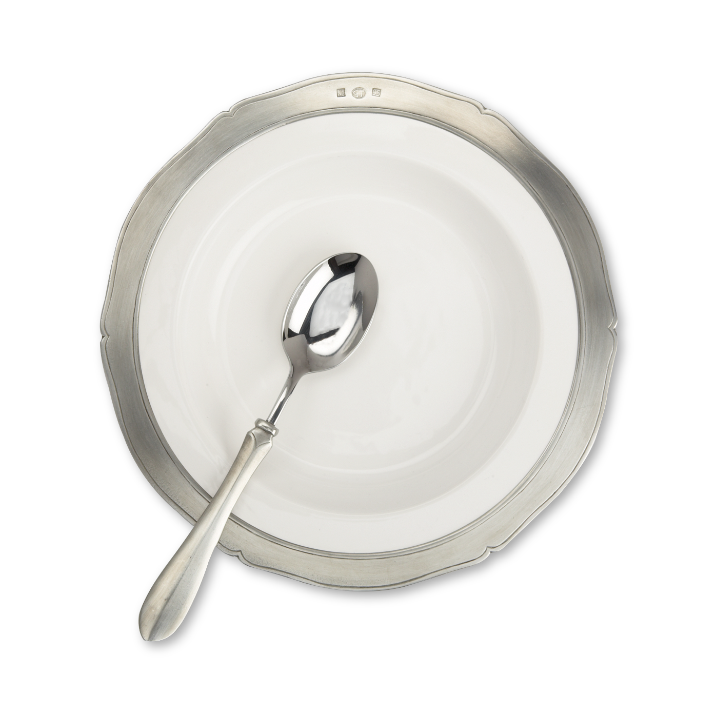Our Viviana soup/pasta bowl features a gracefully scalloped edge that brings an elegant flourish to the dining table. Made by hand from ceramic and 100% Italian pewter.